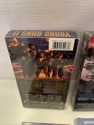 The product is a lot of 4 vintage VHS tapes, including the movies "The Lost Boys," "Blues Brother," and "Young Guns II and National Lampoons Vacation." "The Lost Boys" (1987 film) is a comedy horror vampire thriller starring Corey Feldman. The VHS tapes are new and sealed, making them a great addition to any movie collection for fans of vintage horror and thriller films.