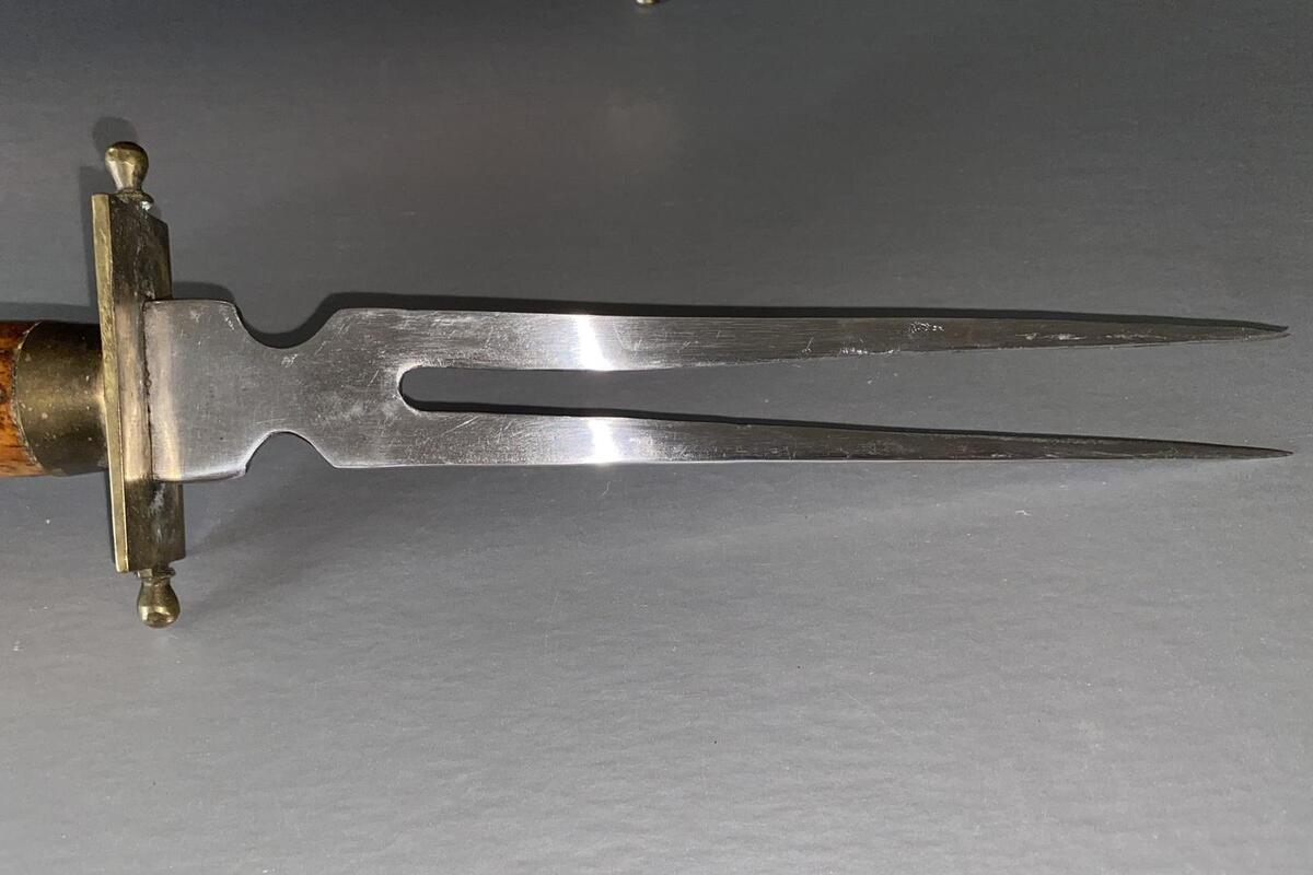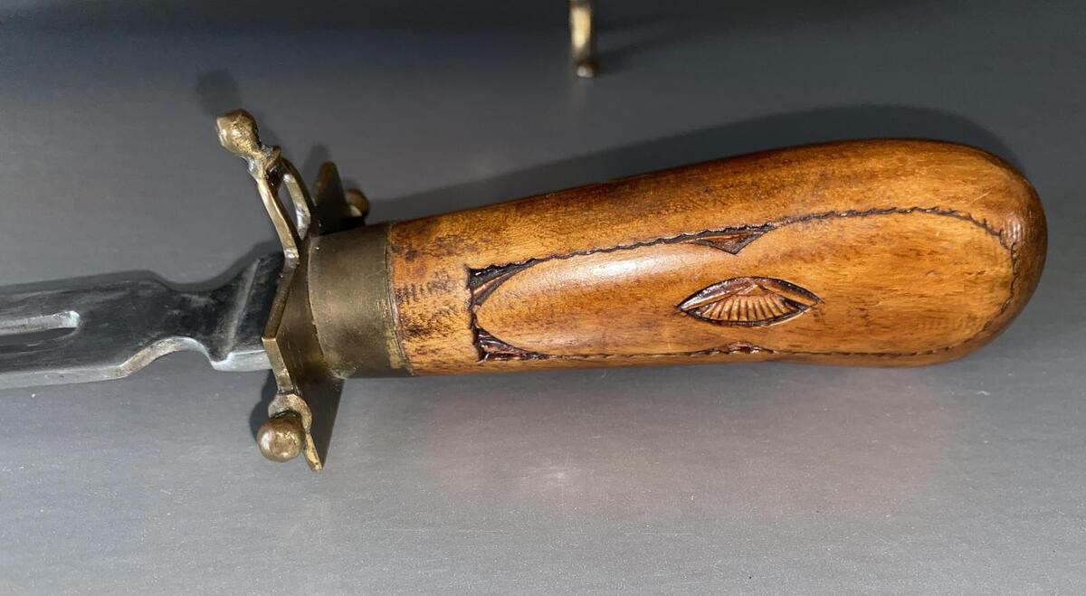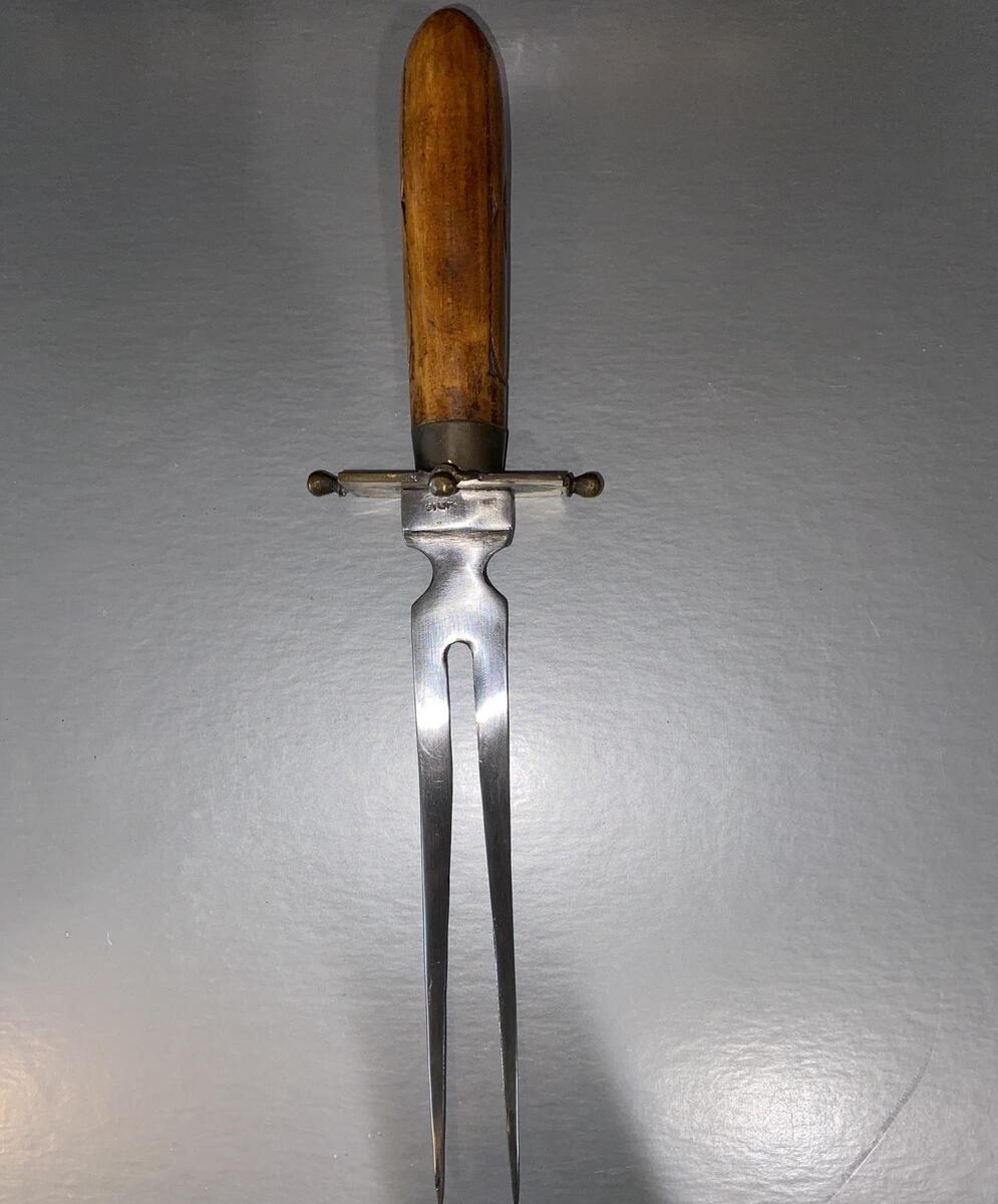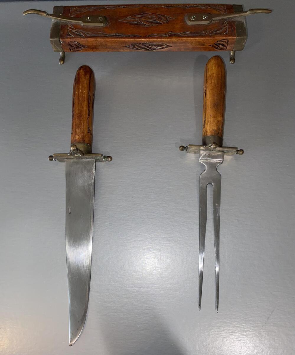 Here we're selling a very nice vintage India made set of a meat carving knife and fork with Hardwood handles that both slide into a beautiful hardwood keeper that's made from matching hardwood. The blades are quite tight within their own wooden handles and they slide snugly into the keeper that holds them. Also, the Brass locking mechanisms are tight and work well too.