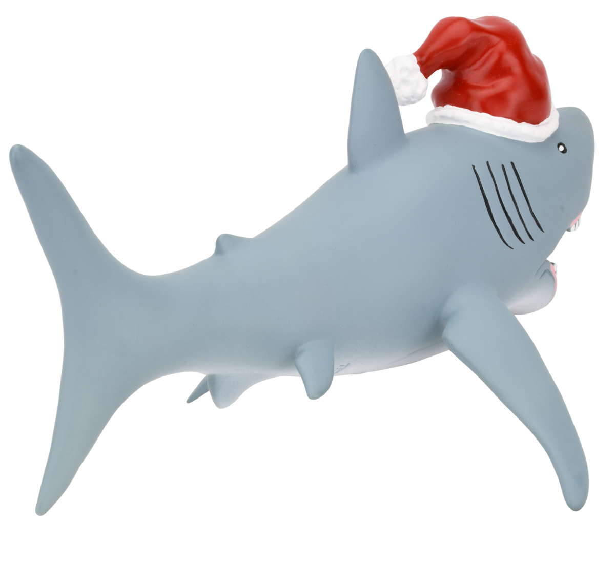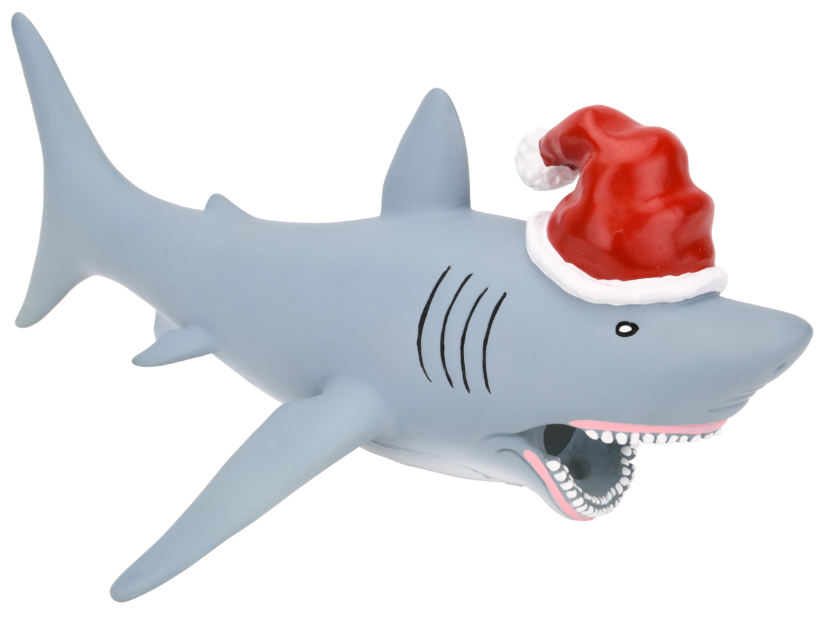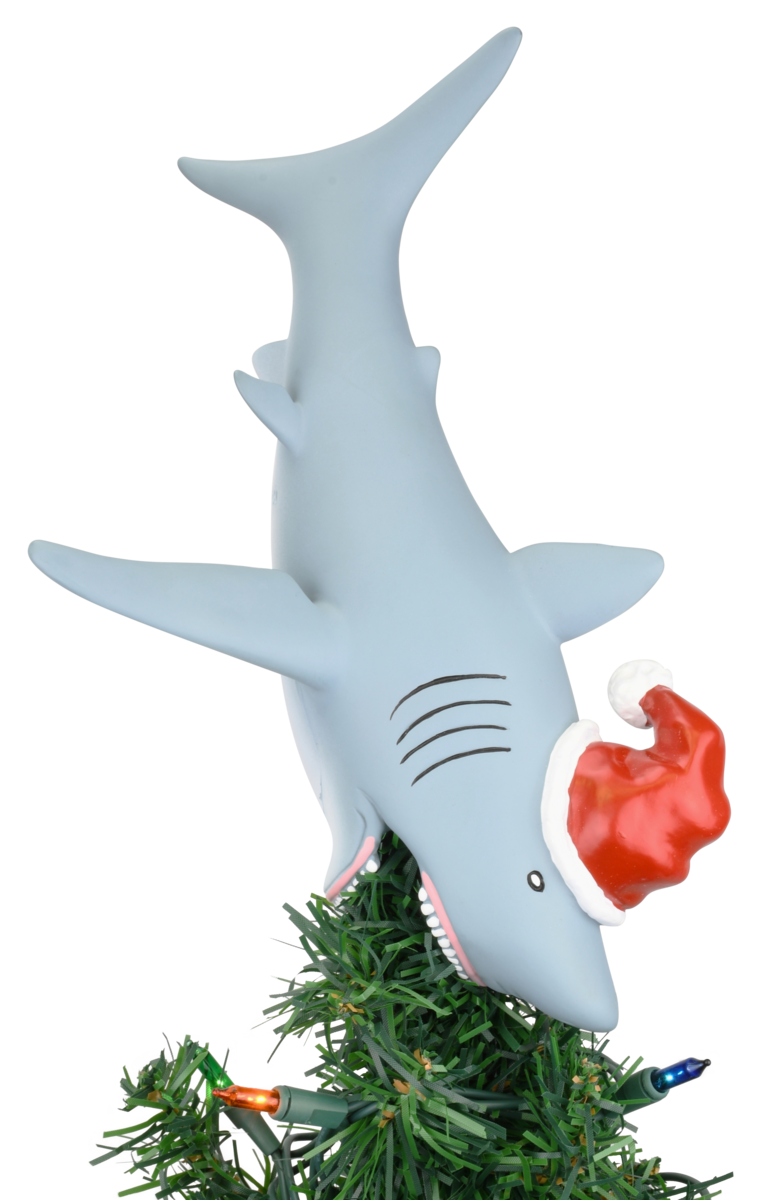 This fun Christmas topper is a Great White Shark wearing a Santa hat. The sharks mouth is open so you can slide the top of the tree inside. Making so the shark is biting down on the tree.