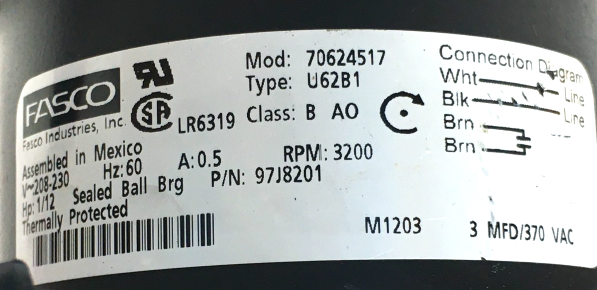 This is FASCO 70624517 Draft Inducer Blower Motor Assembly 97J8201 7062-4517 208/230V 3200 RPM 1/12HP used part, wires cut.