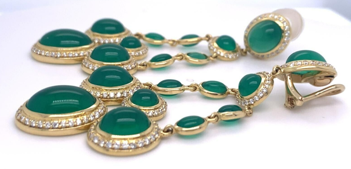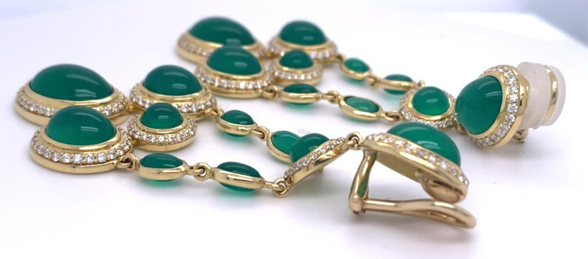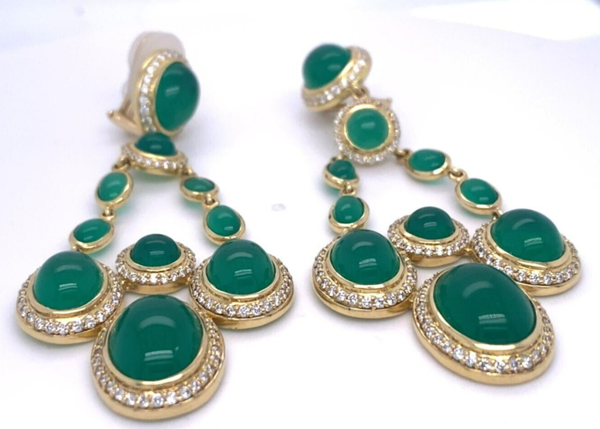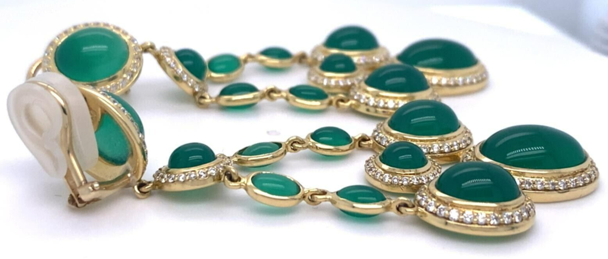 Features a pair of Yellow Gold, Diamond, and Chrysoprase Chandelier Ear Clips