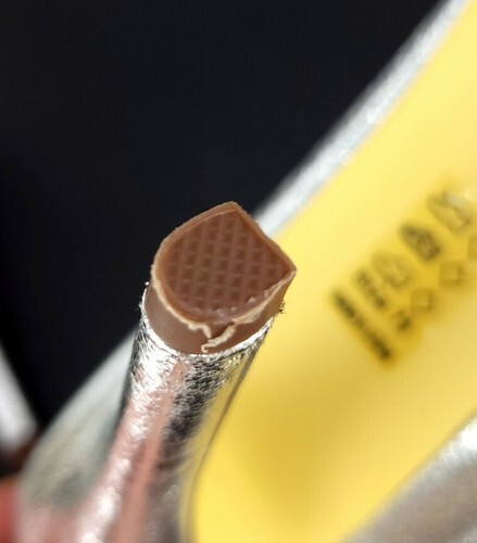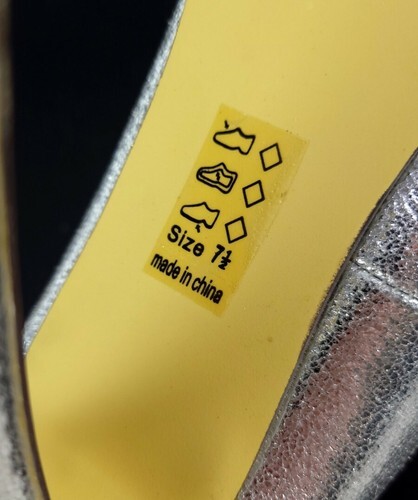 Never worn but has some shelf wear. Heels have some rubbing on the sides as shown in photos. Inside sole has some glue left over.