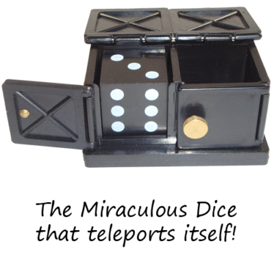 A Mini box with two doors is shown to the audience. A mini die is shown and placed inside of a hat (or paper bag). The Magician states he/she will make the die appear in the box and gets laughs as he/she physically takes the die out of the hat and places it inside of the box!