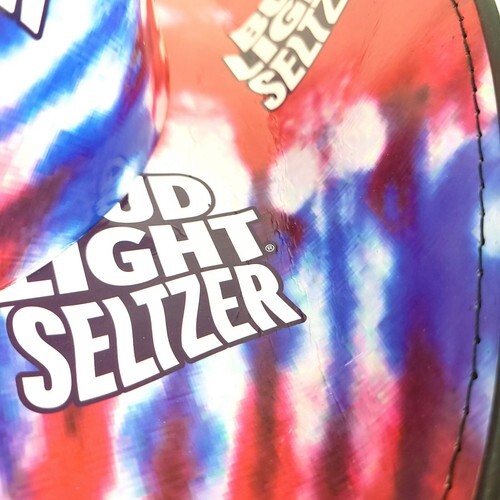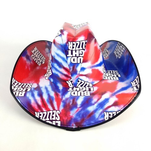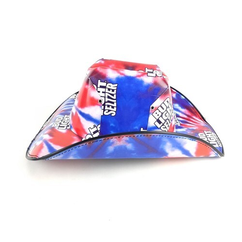 Bud Light Seltzer Americana Cowboy Hat has all-over print label design. Features 1/4" black PVC Trim all around the edge of the brim, and 5/16" Steel rivet/vent holes.