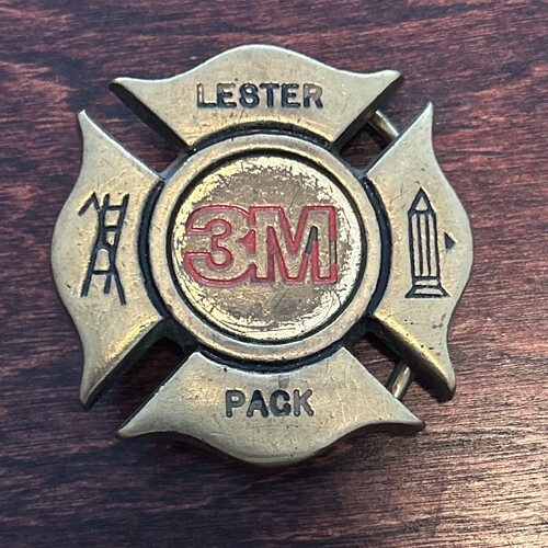This 3M belt buckle badge is a vintage accessory made in Taiwan, ROC. It features a solid brass construction and is designed with the Lester Pack. The buckle is perfect for collectors or those looking to add a unique touch to their outfit. The material is brass and it is made in Taiwan.