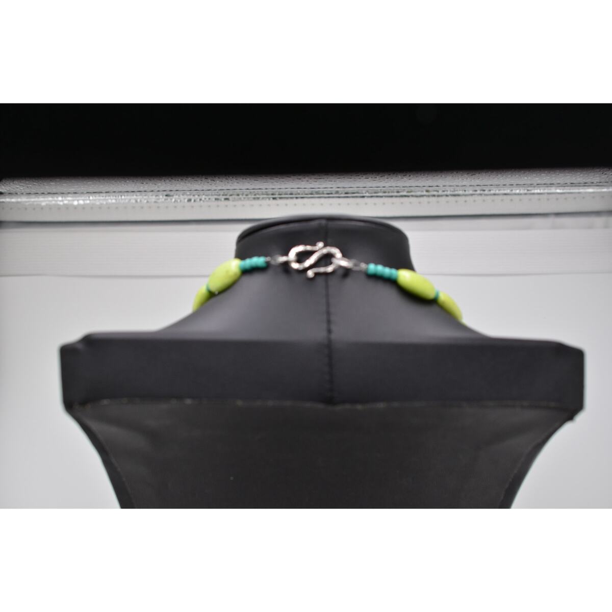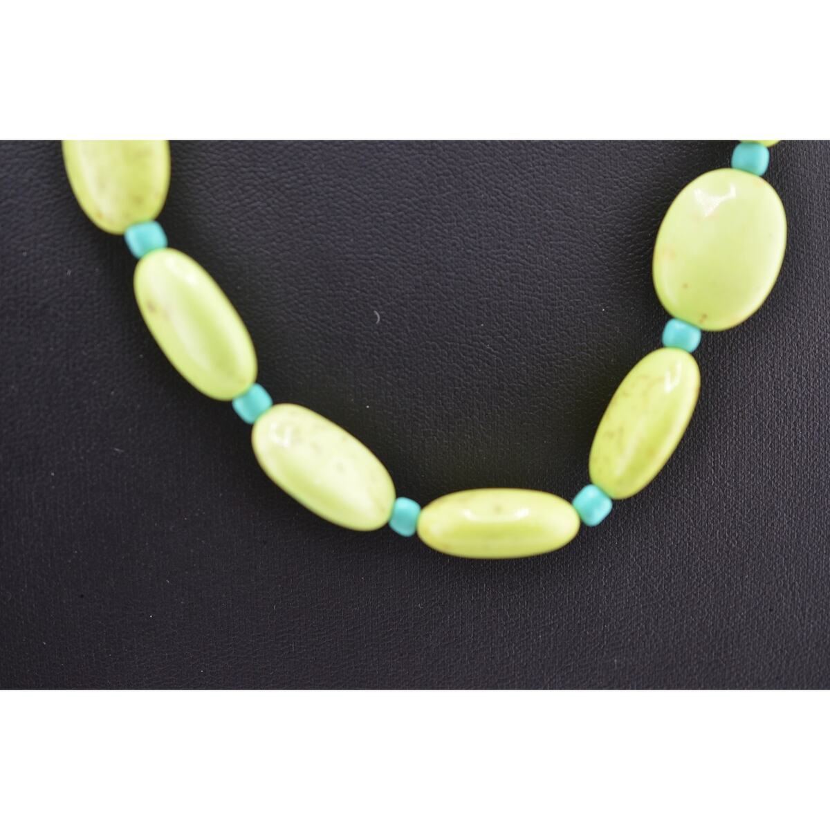 Banana green Howlite necklace with Turquoise color Czech glass beads. Fun to layer or wear This necklace is a one-of-a-kind, handmade by Navajo artist, Mary Winona Roanhorse. The length is 18.5 inches with stainless toggles. Navajo bead artist, Mary W. Roanhorse, certainly outdid herself on this one. A percentage of your purchase is donated to assist Native Women victims of domestic violence.