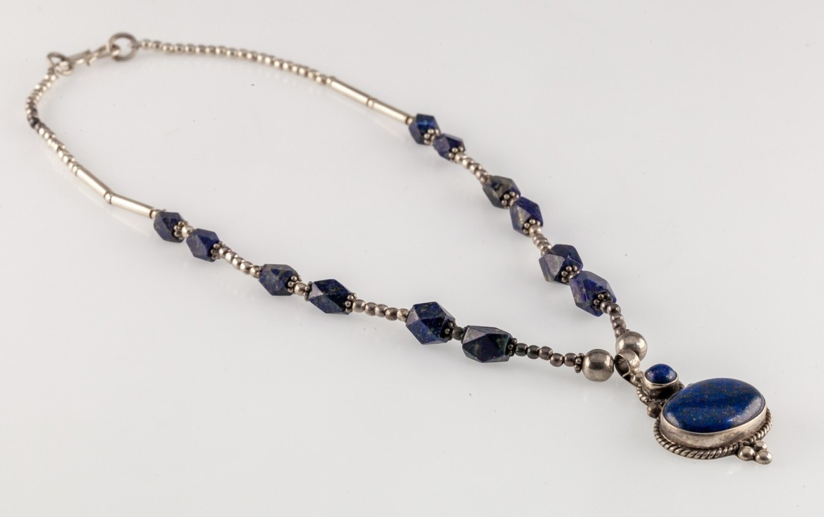 Sterling Silver Lapis Lazuli Pendant Necklace with Geometric Lapis Beads 16"