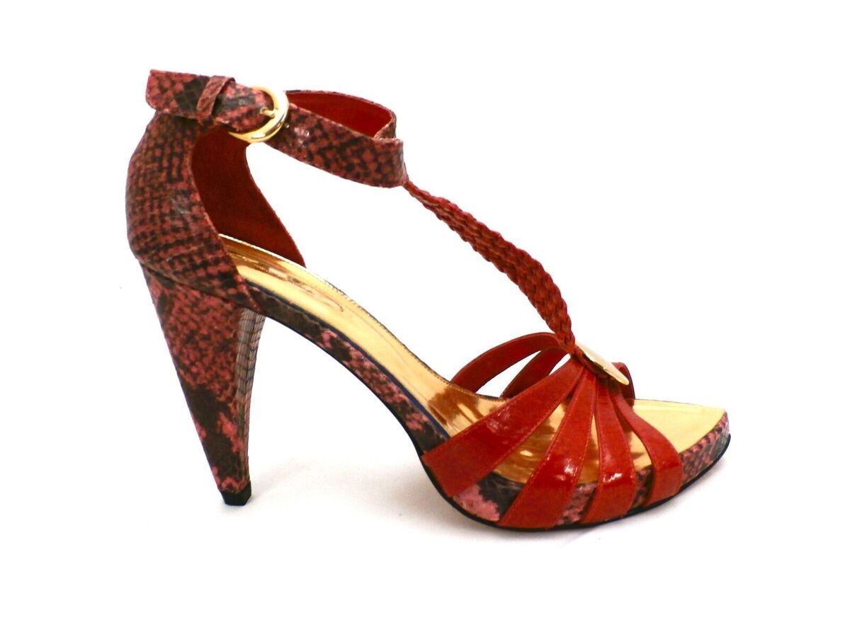Designer Stiletto High Heels Gracienne Womens Sz 10 Red Gold Snake Skin Leather