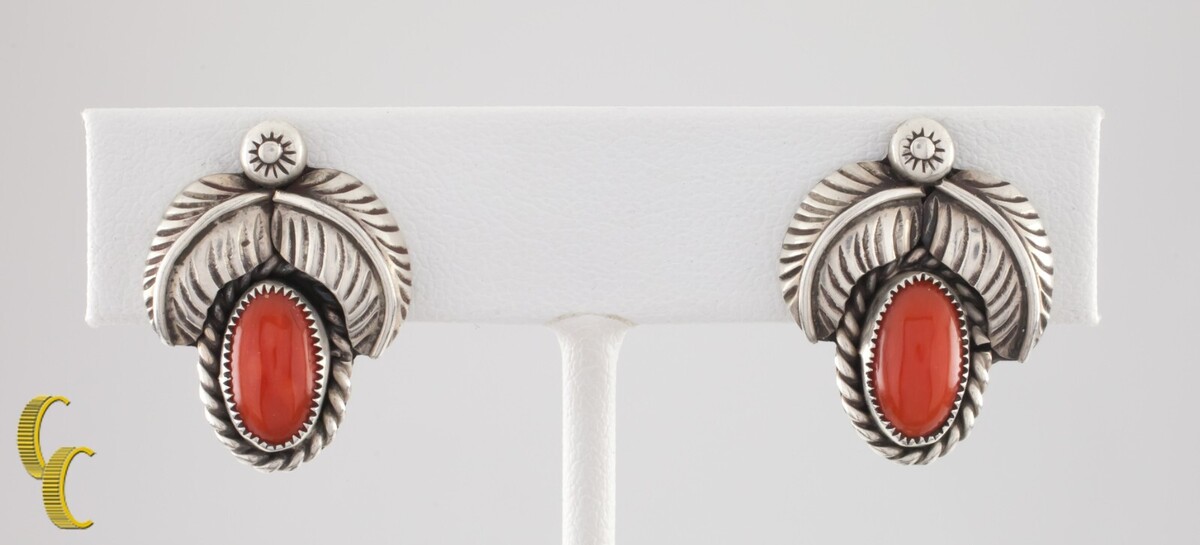 Sterling Silver Screw On Huggie Coral Leaf Earrings Vintage Navajo