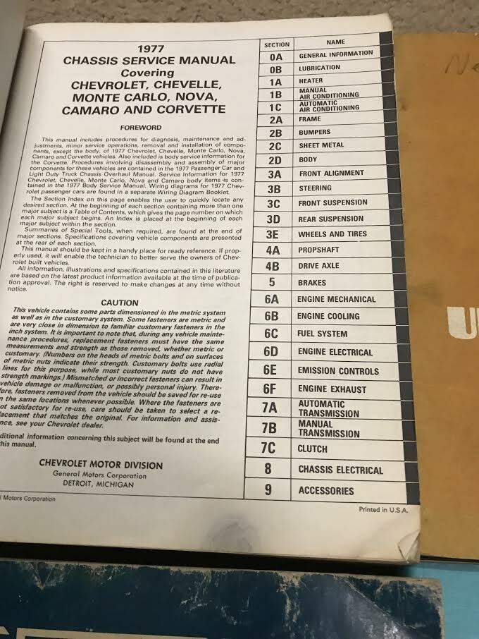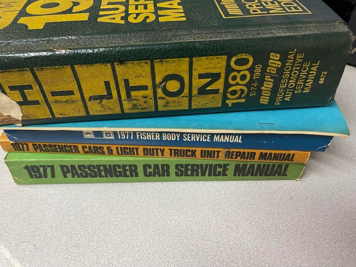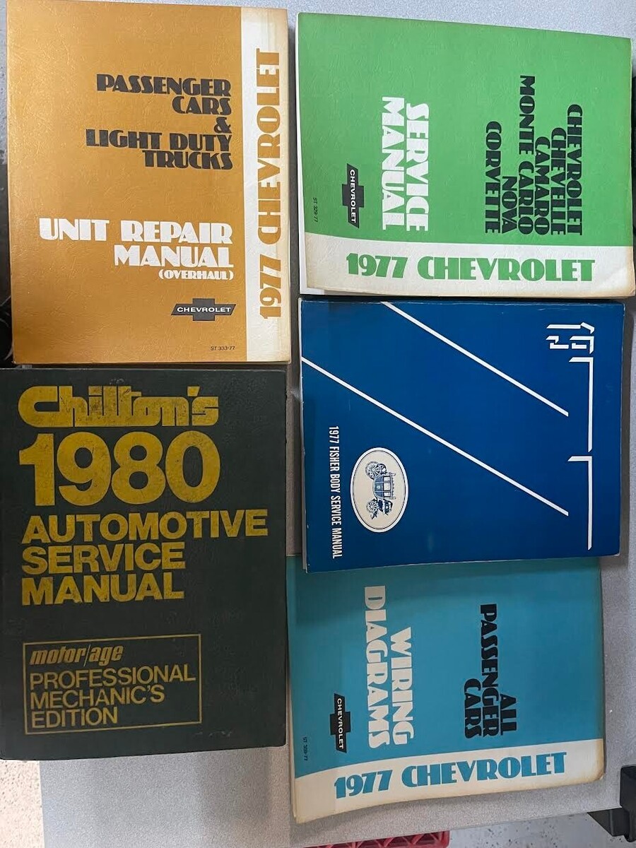 Manuale di servizio Chevrolet Camaro/Chevelle/Nova/Monte Carlo/Corvette del 1977, manuale di riparazione dell'unita, manuale degli schemi elettrici, manuale della carrozzeria Fisher e manuale Chiltons