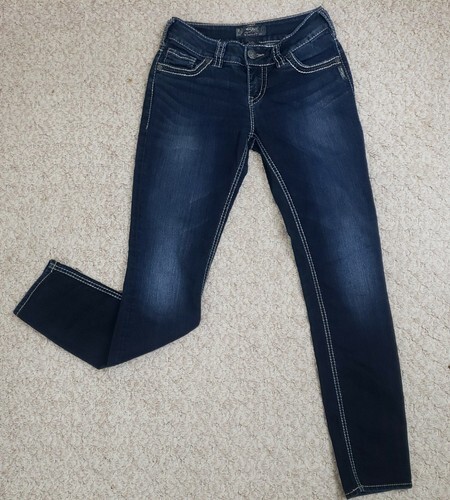 Silver Suki Jeans Womens 27 x 31 Distressed Skinny Blue Dark Wash Faux Flap Pkt