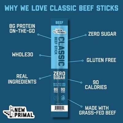 Dated 10/27/2025 ? GRASS FED BEEF STICK: Classic grass fed beef stick mixed with onion, white and black peppers, ginger, and lemon peel formed into a delicious easy to eat stick that?s perfect for convenient snacking at home or on the go. This keto snack pack contains 20 - 1oz sticks. ? KETO, GLUTEN FREE SUGAR FREE: Top 8 allergen friendly! Our meat sticks are naturally sweetened with pineapple juice and honey, made with 0g of sugar, Whole30 approved, paleo, keto, gluten free, and 100% grass-fed beef raised without added hormones or the use of antibiotics. ? 8G PROTEIN PER SERVING: The New Primal beef sticks are the perfect high protein snacks, that are portable and easy to eat. Feed your inner carnivore - Each grass fed meat stick has 8g of protein and just 90 calories per stick. ? HEALTHY SNACKS FOR ON THE GO: Our healthy snacks for adults are great for snacking anytime and anywhere, whether you're at the office, at school, traveling, camping, backpacking, running errands, or relaxing at home. These mess free individually wrapped snacks are easy to eat on the go compared to original beef jerky or other meat snacks! ? THE NEW PRIMAL: Try our full lineup of convenient, high protein, low sugar and low carb protein snacks. Pack crave-able flavors like Spicy Beef, Buffalo Chicken, Lightly Peppered Turkey and Cilantro Lime Turkey. Delicious, on-the-go snacking has never been easier!