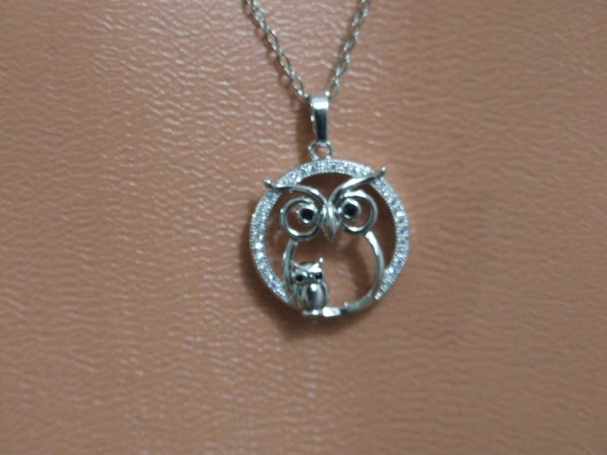 Elegante collar de mama y búho de bebe con el círculo incrustado con muchas joyas de piedras preciosas. Esta pieza de collar tiene forma de plata y en forma de círculo. Todo hecho con una cadena de plata de 18 pulgadas. Una hermosa creacion.