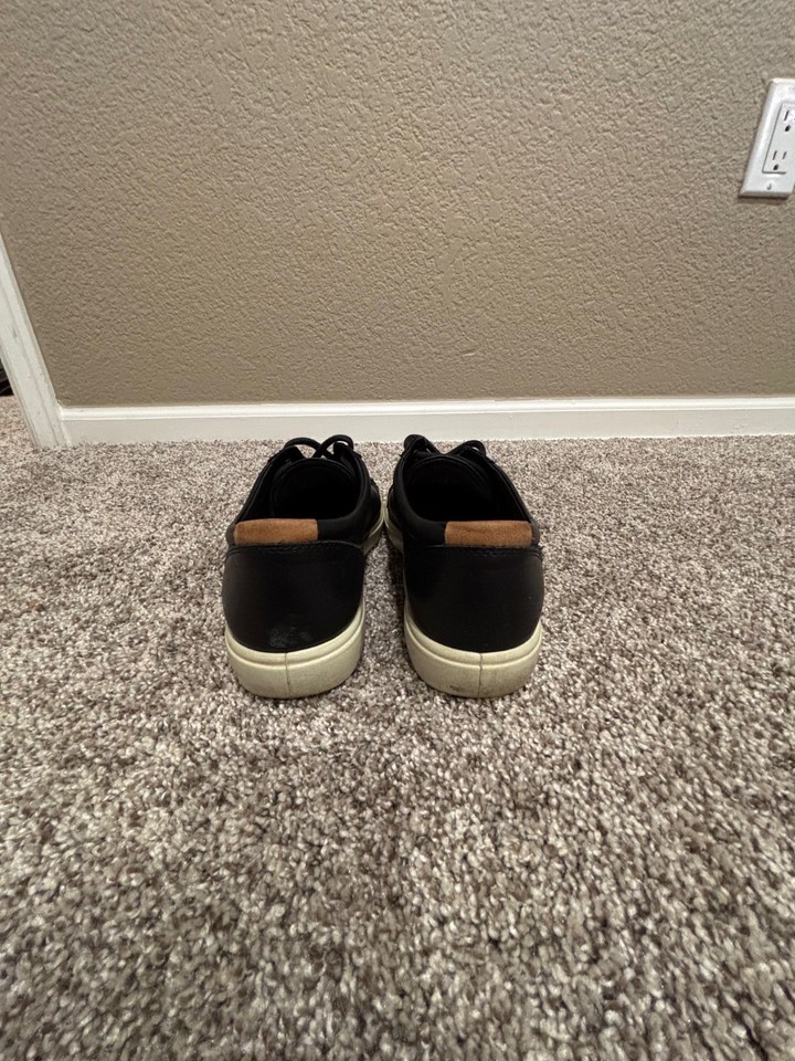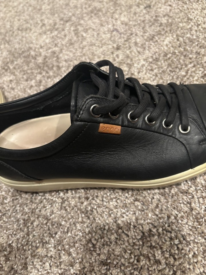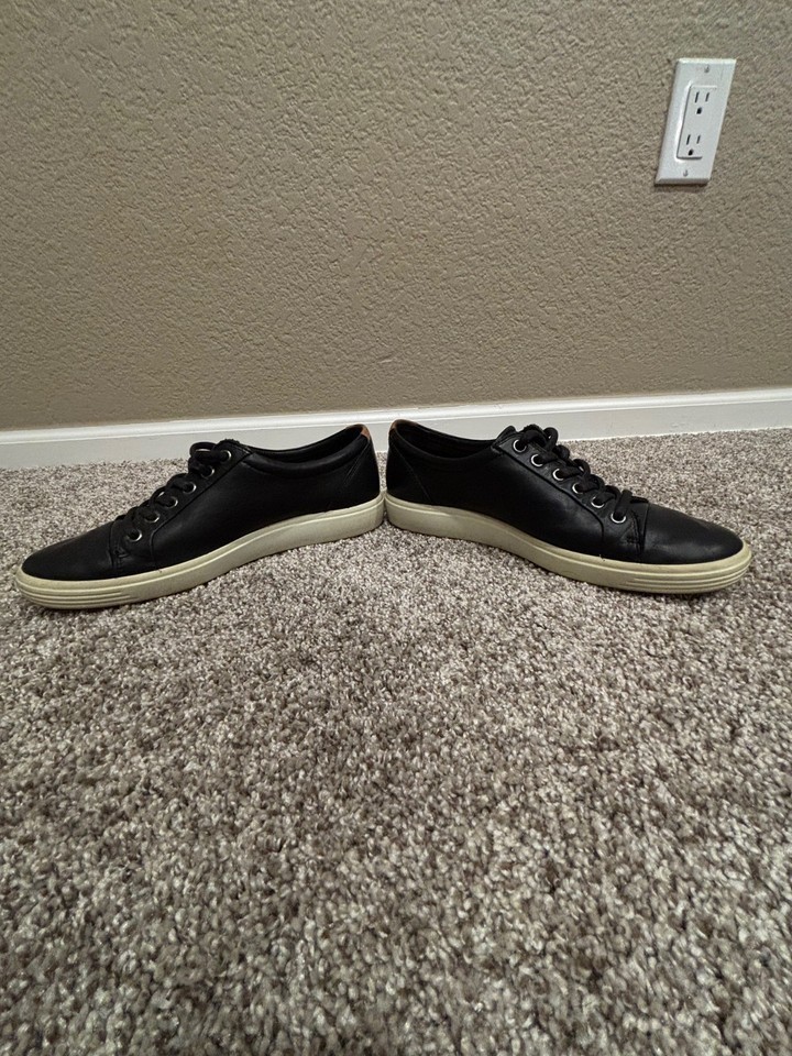 Step into comfort and style with these ECCO Soft 7 black leather sneakers, known for their sleek Scandinavian design and premium craftsmanship. These shoes feature a smooth, supple black full-grain leather upper with minimalistic stitching, metal eyelets, and subtle ECCO branding on the side.The white rubber sole provides a clean contrast, maintaining a refined, versatile aesthetic suitable for casual or smart-casual wear. The interior appears clean and well-maintained, with originally cushioned insoles that offer great support and comfort ? classic ECCO features.The outsoles with ECCO?s signature circular grip pattern visible and intact, ensuring excellent traction. The heel counter includes a subtle tan accent strip, adding a refined designer touch to the back profile.These sneakers are perfect for pairing with denim, chinos, or shorts ? ideal for daily wear, travel, or work environments that demand both comfort and sophistication.