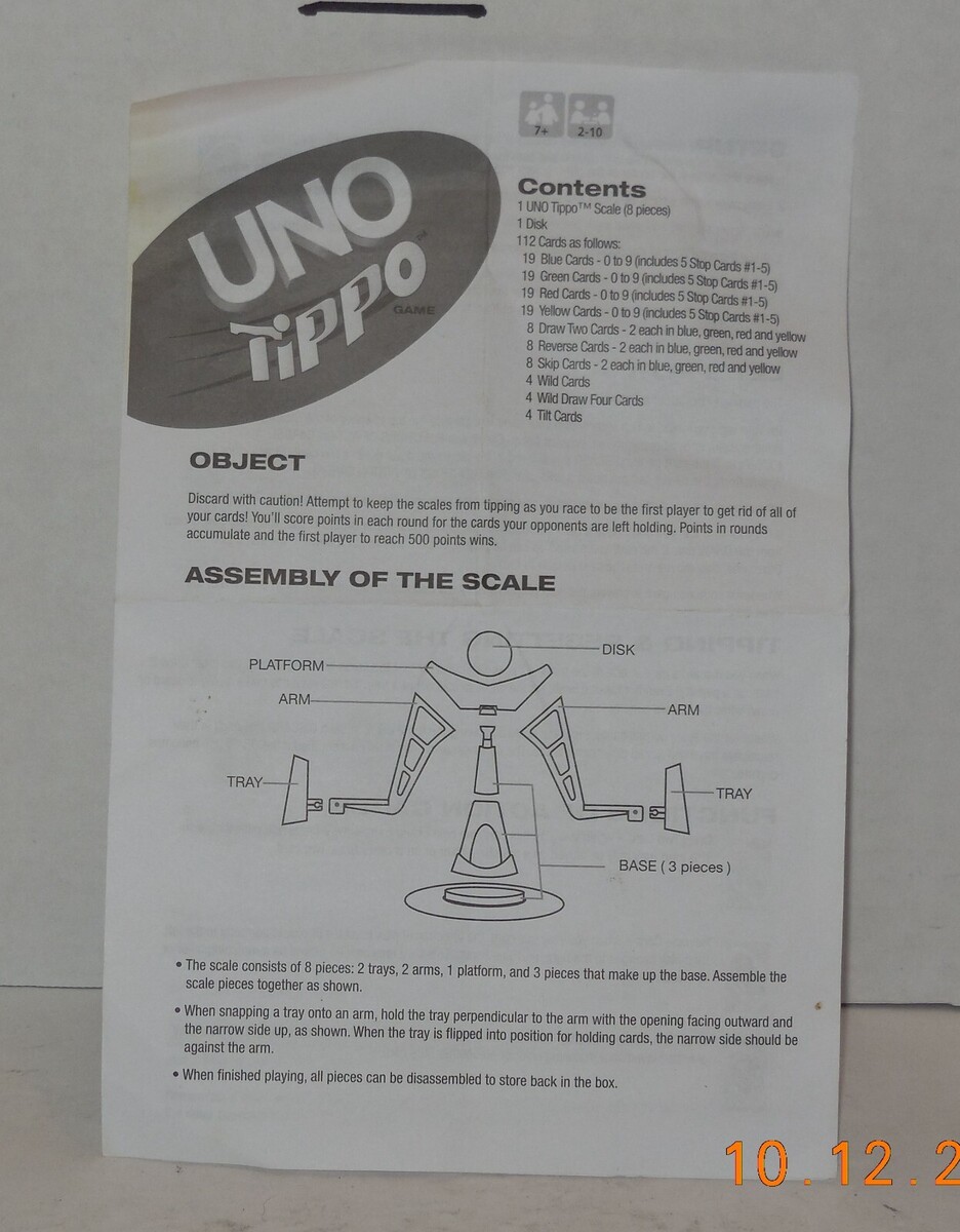 For Sale is a 2009 Mattel UNO TIPPO Board Game Replacement Instructions Part Only. it in good Used condition what you see is what you will receive. Please ask Any and All Questions prior to purchasing. Fast Same or Next day shipping with Free Delivery Confirmation within the U.S. Payment Due within 7 days of purchase (if you need more time please let us know In advance) we love to combine shipping is always a Yes and Most of the time Additional Items Ship for free.