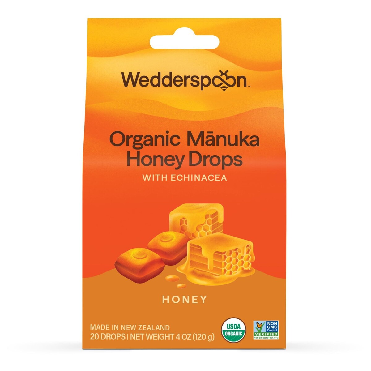 4/26 Wedderspoon Organic Manuka Honey Drops, Honey Echinacea, 20 Count (Pack of 1) | Genuine New Zealand Honey | Perfect Remedy For Dry Throats