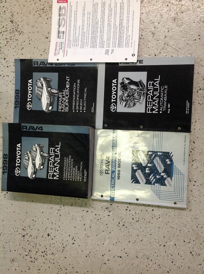 Manuel d'entretien d'usine Toyota Rav4 1998, manuel des schemas de cablage, supplement au manuel d'entretien, manuel d'installation du courant alternatif, manuel de la boîte-pont et pages du bulletin de service technique.