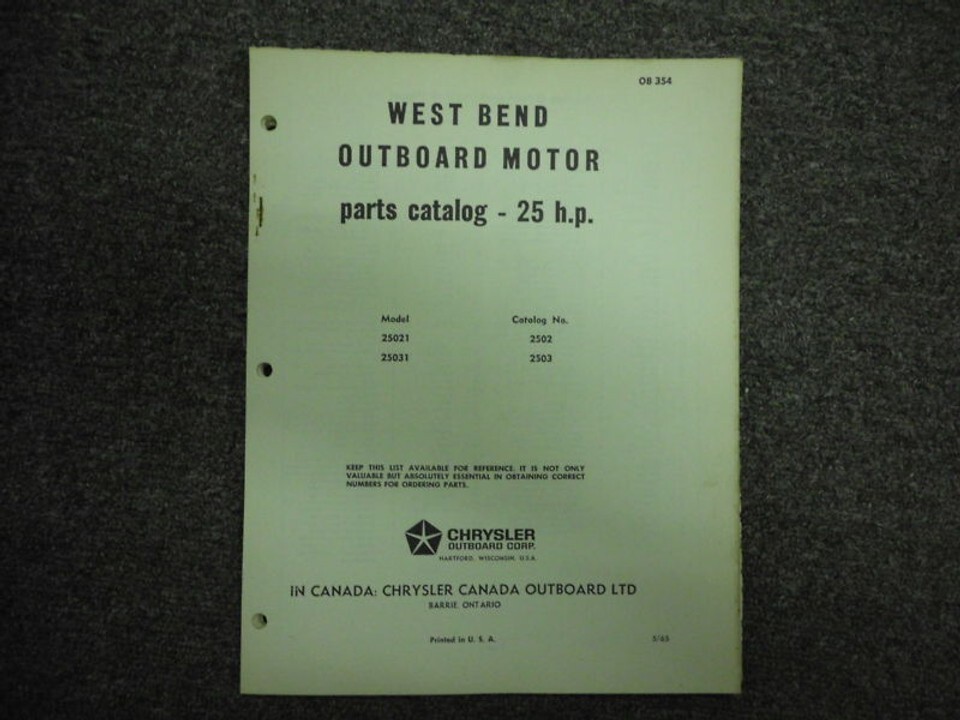 Un catalogue de pieces detachees pour hors-bord Chrysler de 25 CV de 1965. Pour les numeros de modeles 25021 et 25031. Quoi tu vois c'est quoi toi volonte recevoir, nous ne le faites pas utiliser des stocks