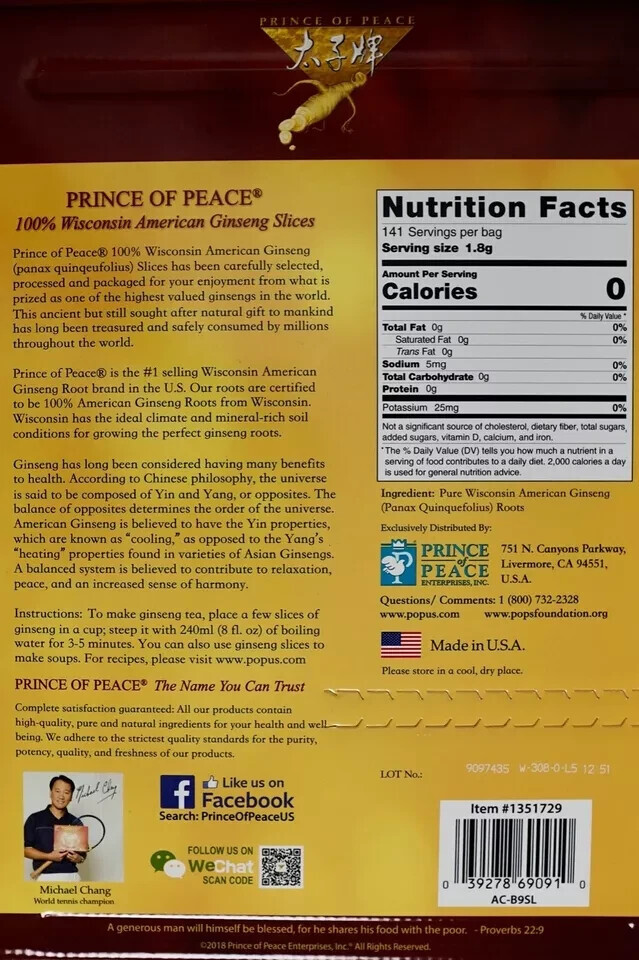 Prince of Peace Pure Ginseng Slices 100% Wisconsin American, 9 Oz Opened,Vacseal