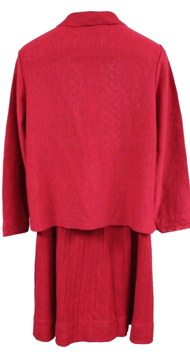VTG Unworn 1970s Pink Red Rayon Knit Sweater Suit w/ Openwork Top & A-Line Skirt