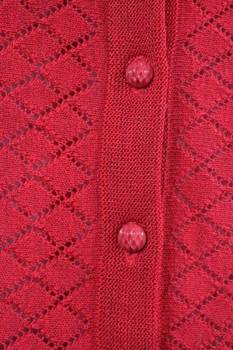 Elegant vintage unworn sweater suit (1970s era) in a rich pink-red knit with subtle purple threads woven throughout. The top features long sleeves, a unique openwork knit front, and stunning pink buttons that elevate the design. The matching skirt is an easy A-line silhouette with a fold-over 1" waistband and elastic for comfort.