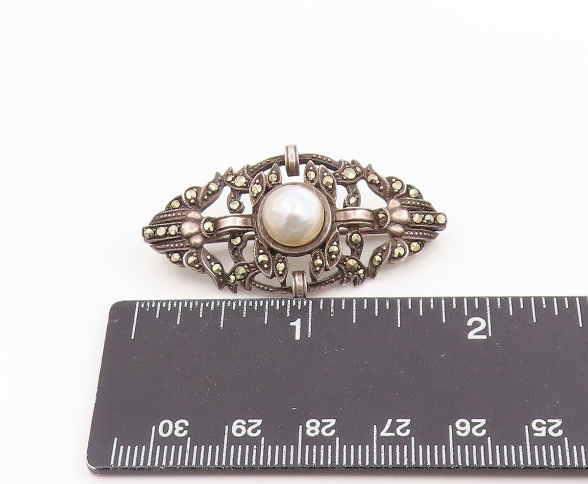 925 Sterling Silver Vintage Brooch Pin GERMANY Elegant Pearl & Marcasite BP12515