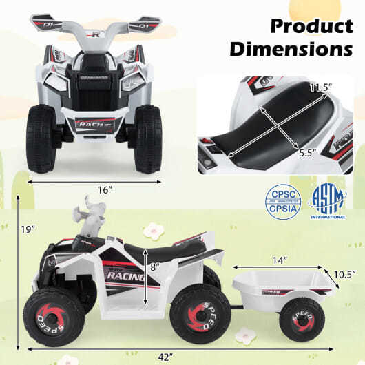 6V Kids Electric ATV Quad Car with Detachable Trailer-White - Color: White
