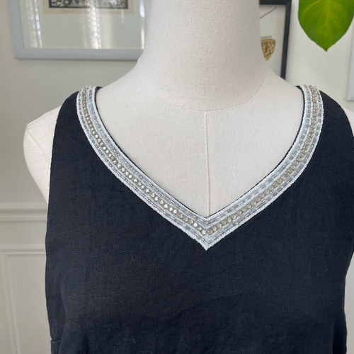 Women?s Tommy Bahama 100% linen V-neck shift dress with cotton lining. On seam hip pockets and V-neck. The V-neck is trimmed in subtly silver metallic bead work. There are a couple beads missing up near the shoulder. See photos. I don?t think it?s very noticeable, especially with all the reflection of the other beats. Laying flat measures 33 inches shoulder to hem, 18 inches armpit to armpit and 18 inches straight across the waist. Keyhole button closure in the back.