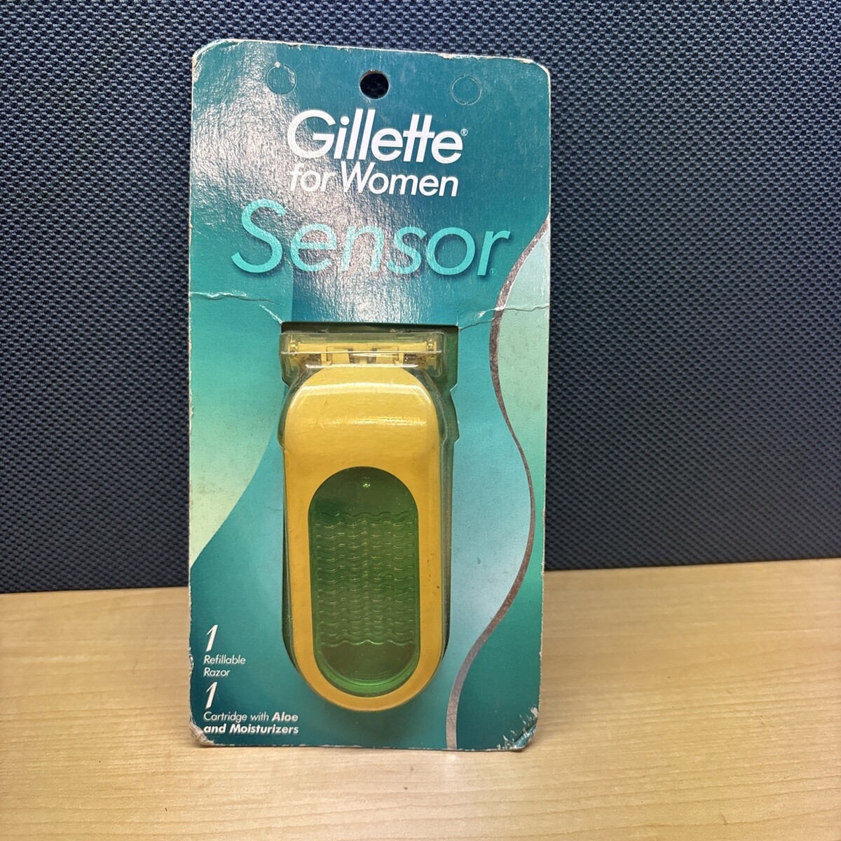 Vintage 1998 GILLETTE Sensor for Women Razor. New old stock . Some of the plastic on the packaging is discolored as these are brand new old stock. The razor itself is in original condition. Some of them have the plastic separating from the cardboard. Packaging may be re-glued back together to seal the product inside. Also, some of the cardboard may be exposed on back as it is old and coming apart.