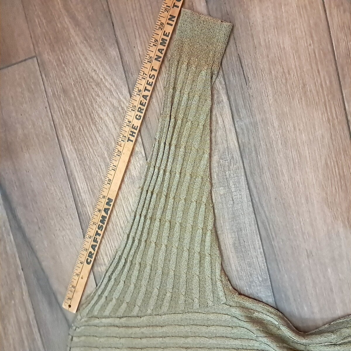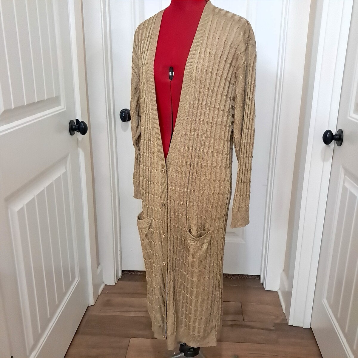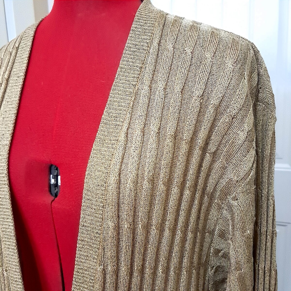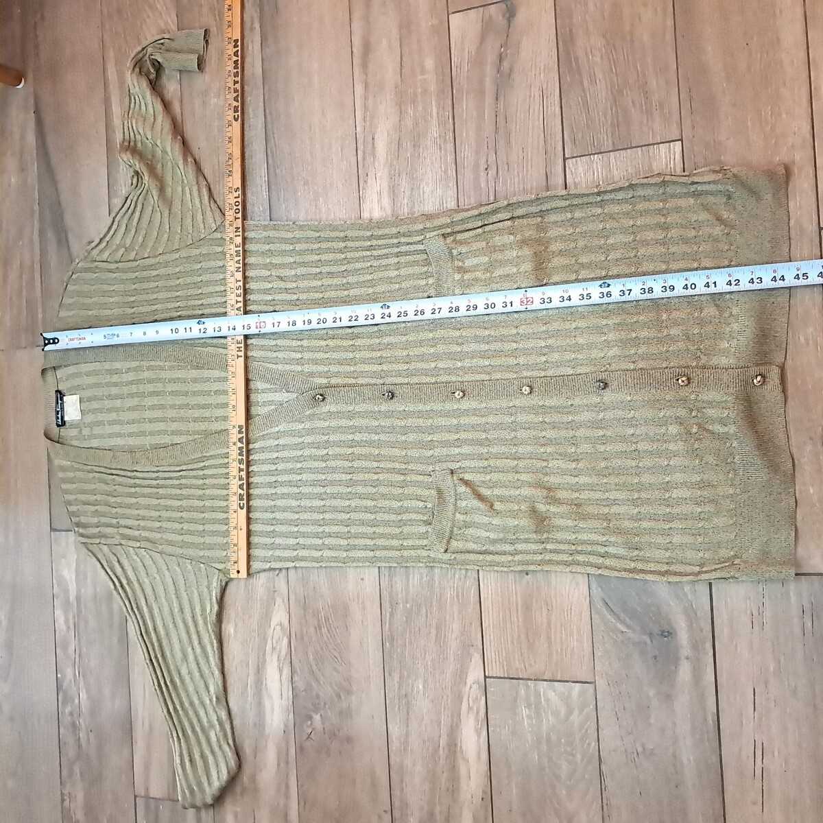 Thin, stretchy long cardigan in a gold color. Some of the brass tone buttons are tarnished, but overall very good condition. See pics for measurements.