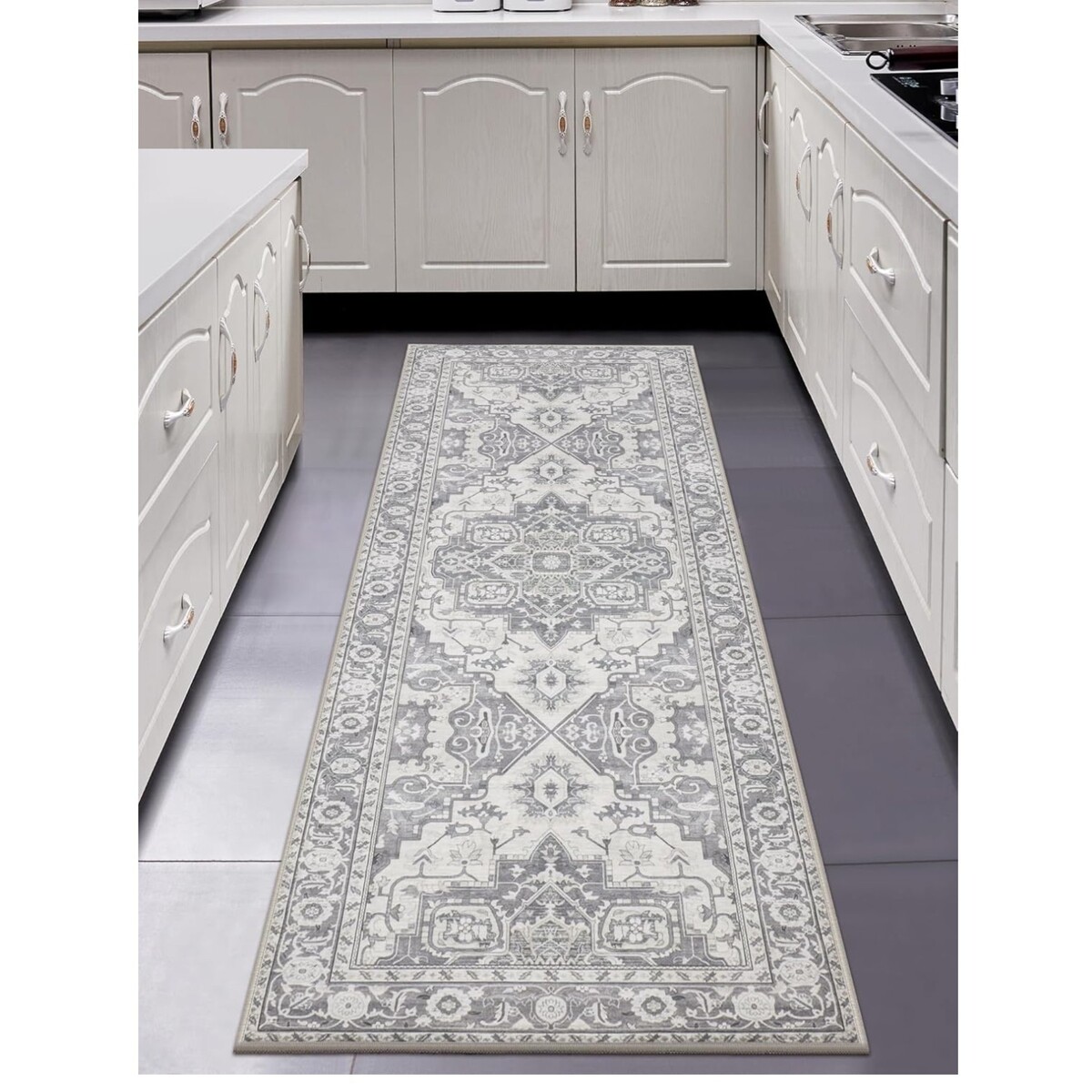 Stain Resistant Vintage Runner Rug 2x6 - Machine Washable & Non-Slip Ivory Grey