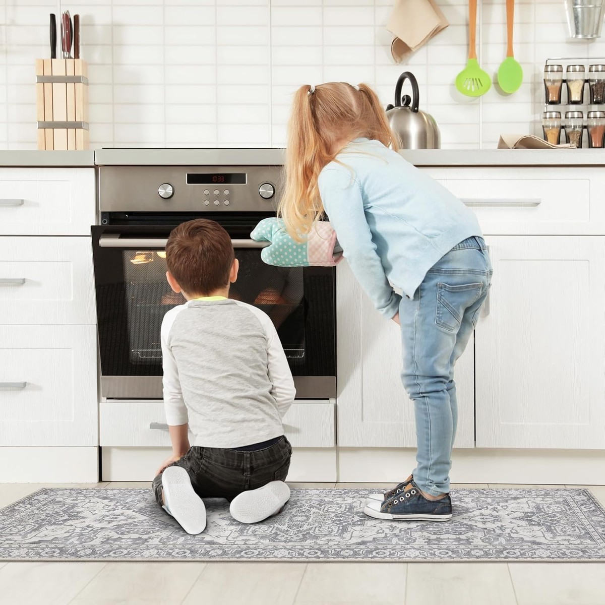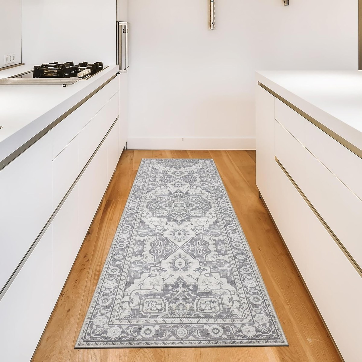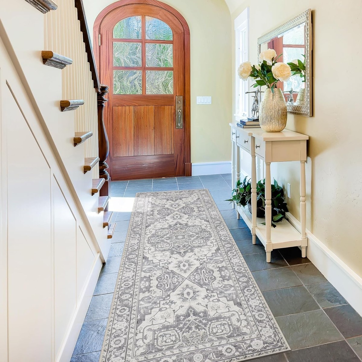 Stain Resistant Vintage Runner Rug 2x6 - Machine Washable & Non-Slip Ivory Grey