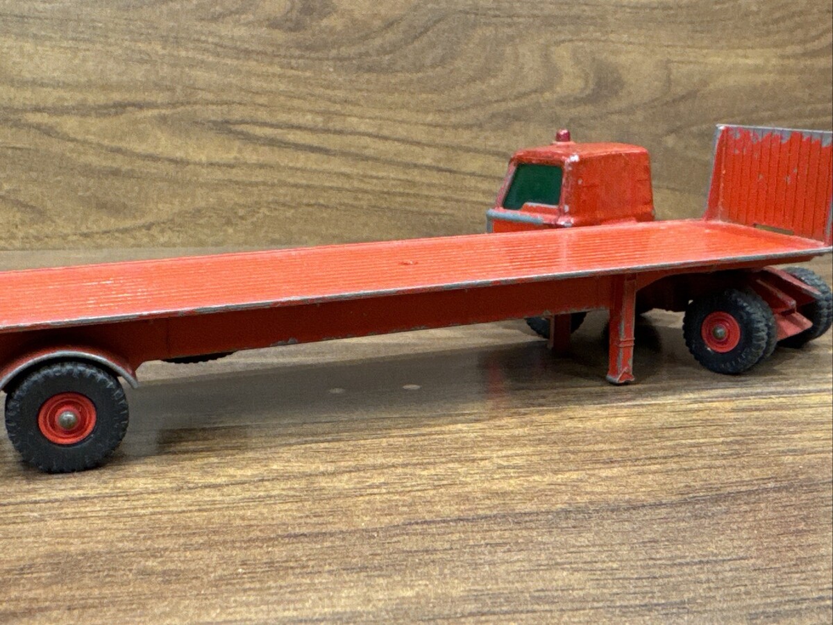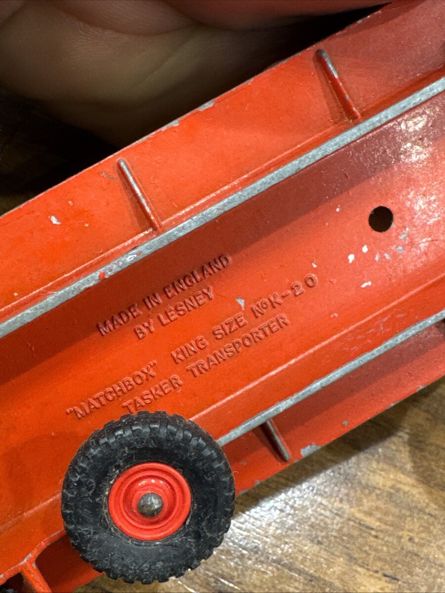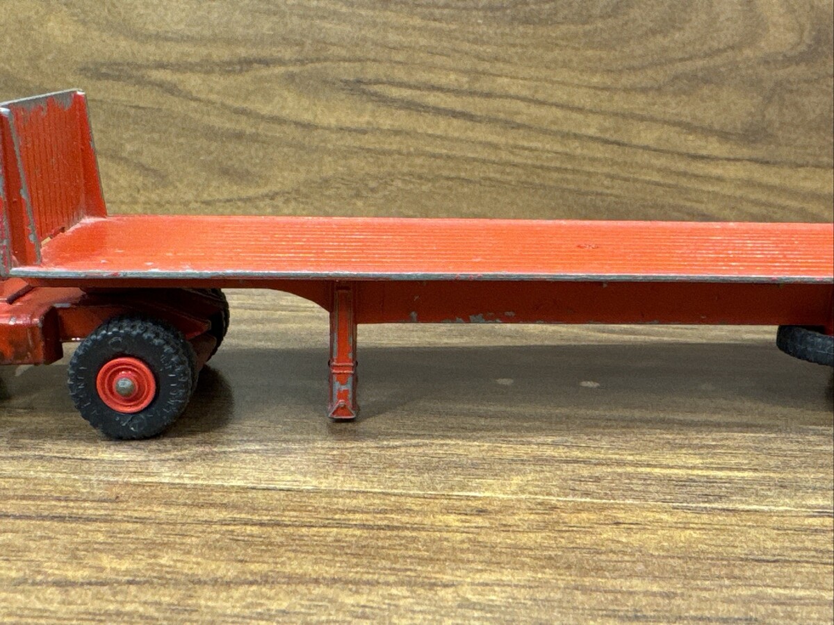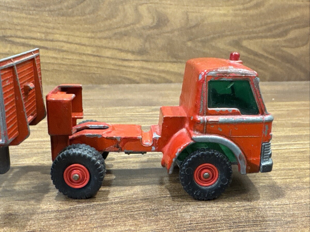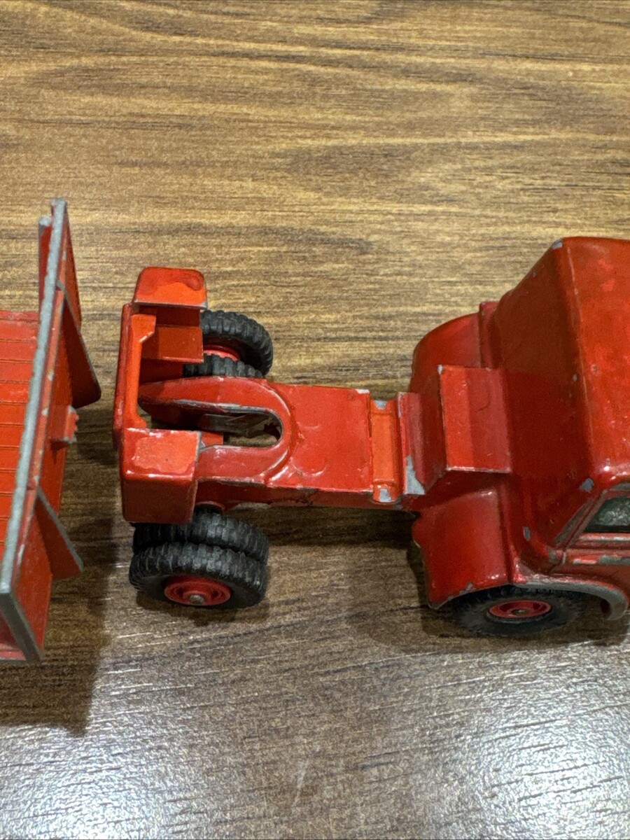 The product is a vintage Matchbox diecast Ford truck with a trailer, featuring a red color and a 1:60 scale. It includes 2 Ford tractors and was made in the United Kingdom. The K-2 K20 K 20 model is a classic toy vehicle that collectors of vintage diecast vehicles would appreciate for its detailed design and historical significance in the world of toy vehicles.