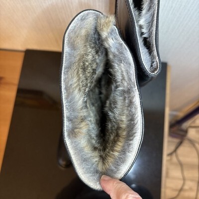 Some light wear to the toes and furry openings. Sizing tag is inside at the bottom of the insole, too furry to see in a photograph, These fit ever so slightly large to accommodate a winter sock and/or slip on since there is no zipper.