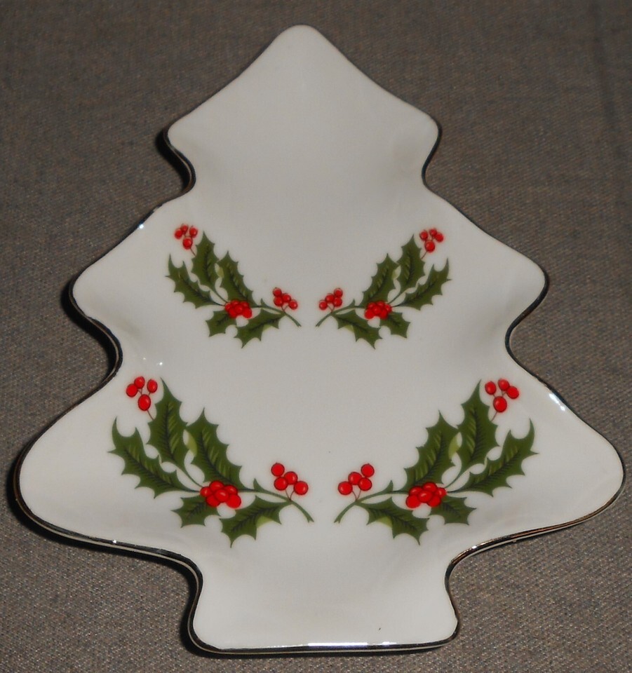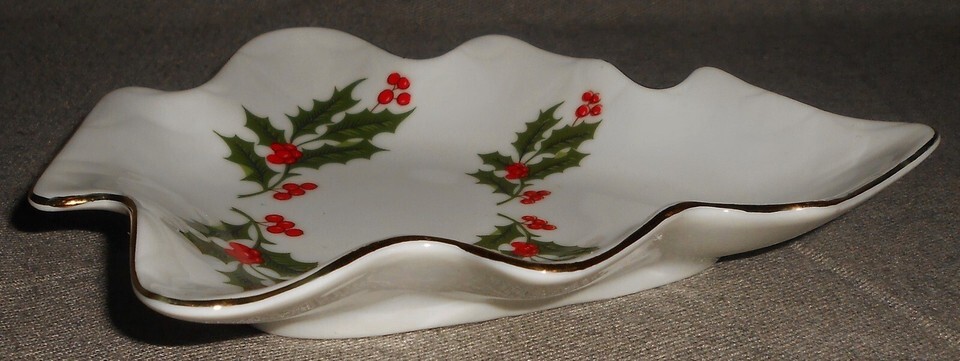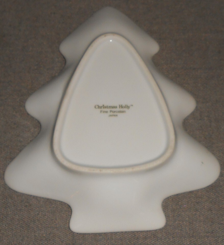 This is a small Christmas Tree Shaped Nut or Candy Dish that is marked on the back as follows: Christmas Holly - Fine Porcelain - Japan. It is shallow at 3/4" tall and it measures approx. 6"x 5" at tallest and widest points. It is in good pre-owned condition with no chips or damage.