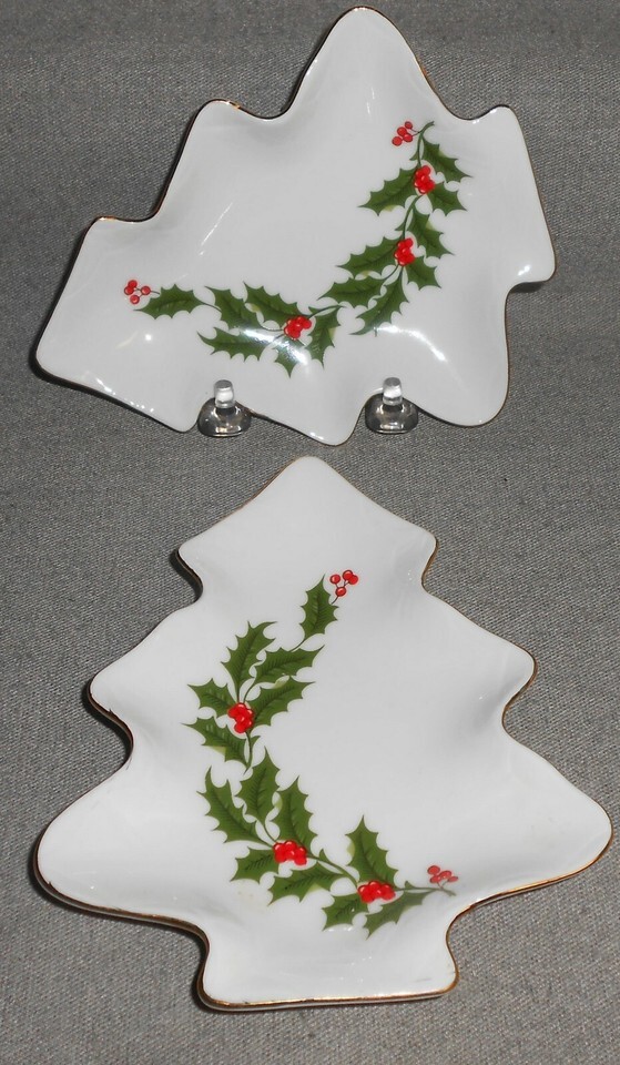 This is a Pair of Tree Shaped Dishes that measure approx. 6 1/4" tall and approx. 5" wide at widest point from Macys and All The Trimmings with a Christmas themed Holly and Berry Pattern. Both are in good pre-owned condition with no chips or cracks. They will be packaged in original box which serves it's purpose but is worn from age - great for storing dishes from year to year.