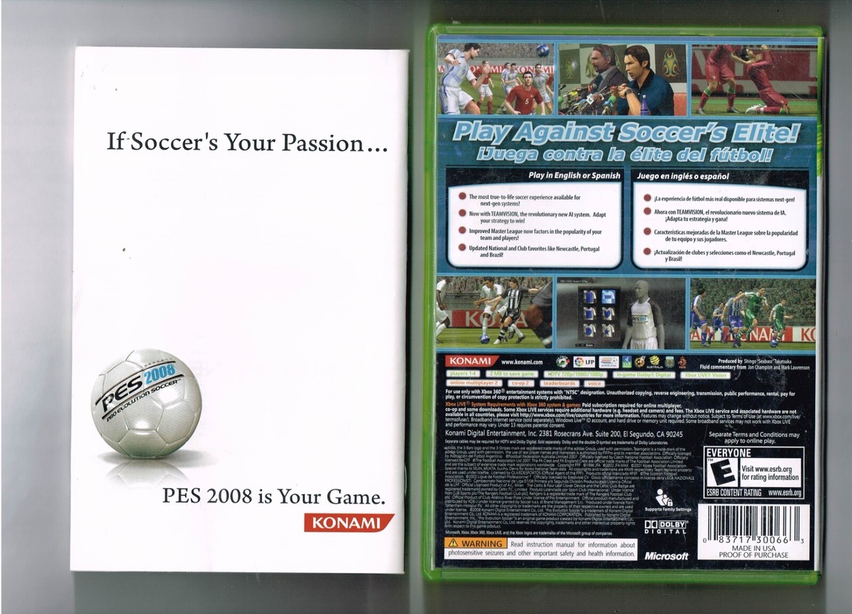 For Sale is a rare and hard to find PES Pro Evolution Soccer 2008 Xbox 360 video Game CIB! Its In good USED condition and has been Play Tested as can be seen from the pictures provided. Please ask Any and All Questions prior to purchasing. Fast Same or Next day shipping with Free Delivery Confirmation within the U.S. Payment Due within 7 days of purchase (if you need more time please let us know In advance) we love to combine shipping is always a Yes and Most of the time Additional Items Ship for free. SKU4MS