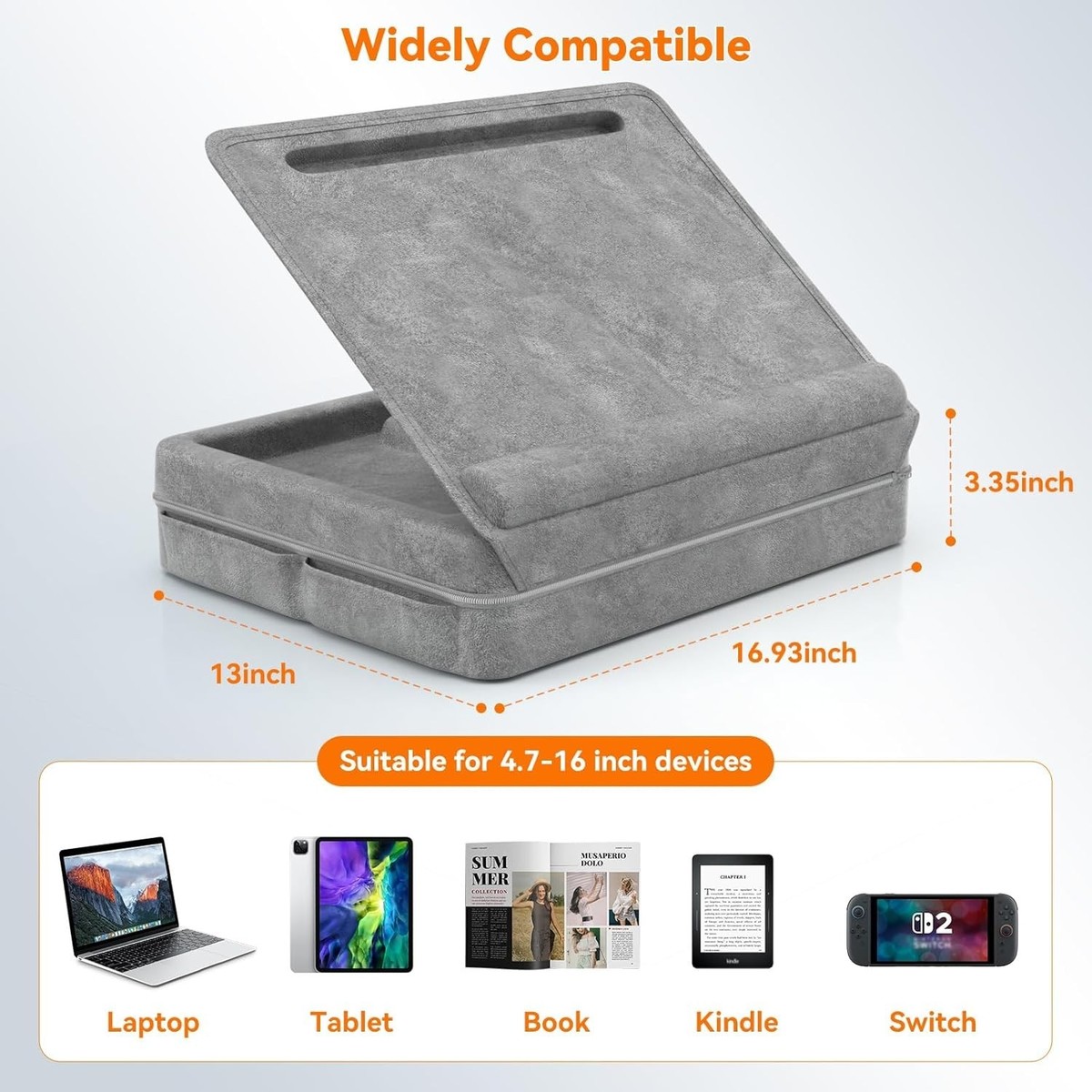 Features: Adjustable Stand,Anti-Slip,Multi-functional,Adjustable,Portable,Large Capacity Storage,Soft Skin-friendly,Skin-friendly fabric cover,Memory foam cushion,Wrist pad,Removable wrist pad,Carrying handle,Notch for tablet/phone,Storage compartments,Pockets for accessories