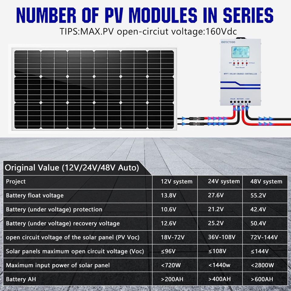 ?WIDE RANGE SOLAR VOLTAGE/POWER SUPPORT?Controller support High PV Input Power/voltage. Controller can accept Solar voltage up to 160V. When battery is 12V system: Suggest Solar power 720W, suggest range:DC18V~DC72V ; 1440W DC36V~108V when 24V ; 2100W DC54V~144V when 36V ; 2800W DC72V~160Vwhen 48V.