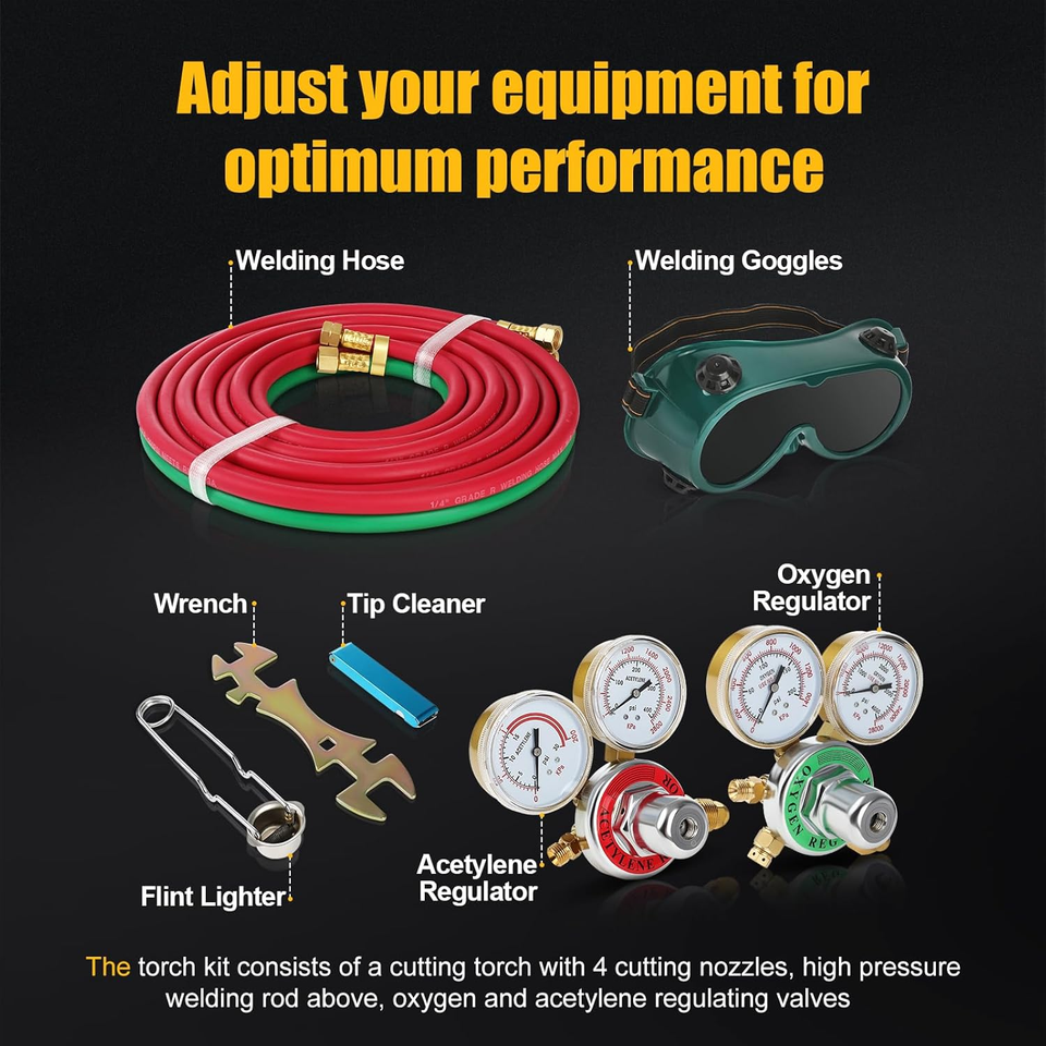 ??????? ????????:Welding torch kit includes 1 oxygen regulator, 1 green (ox) welding hose, 1 red (ac) welding hose, 1 welding torch handle, 1 cutting tip, 3 welding tips, 1 nozzle cleaner, 1 acetylene regulator, 1 safety goggles, 1 lighter, 1 wrench, 1 carrying case.