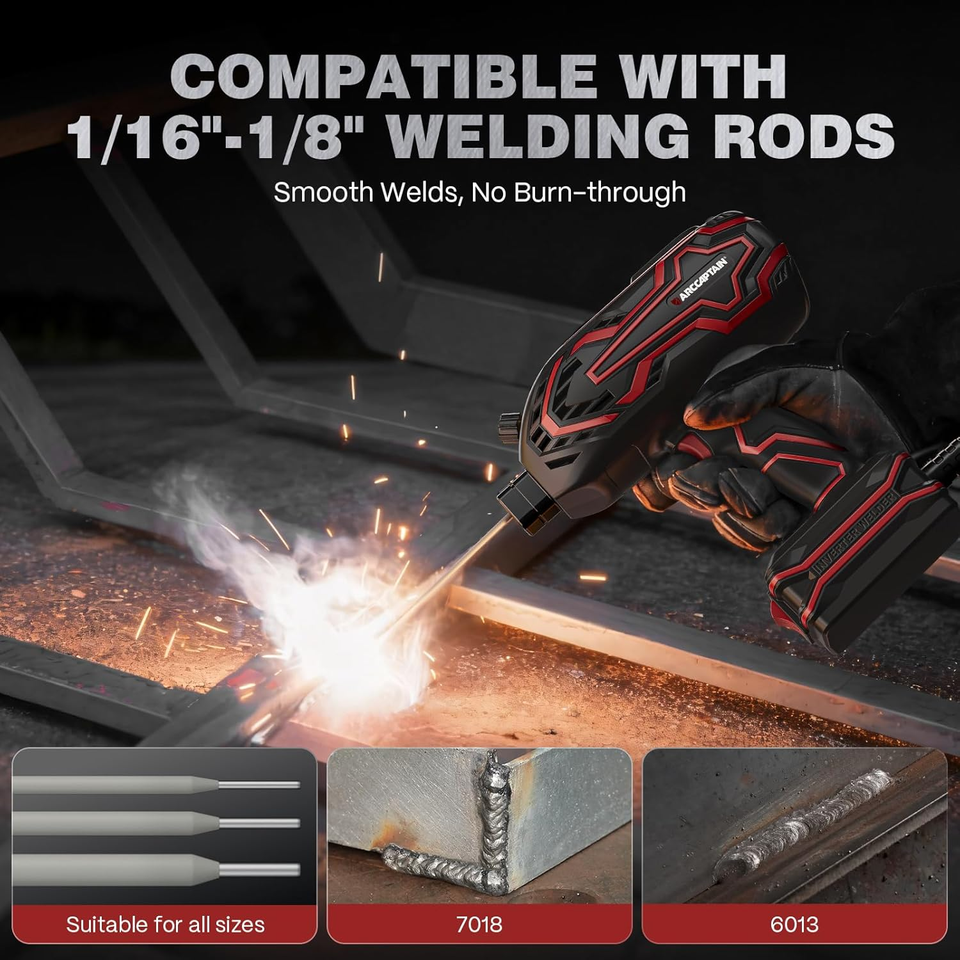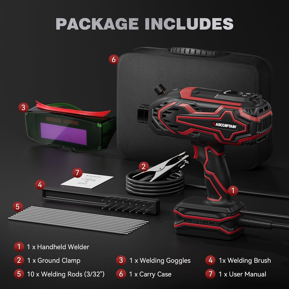 Upgraded Accessories for Efficient Welding: This welding gun is equipped with auto-darkening welding goggles to protect the welder?s eyes from fatigue. The upgraded ground clamp not only provides more stable current but also has a more robust structure for greater durability. The 8ft extended power cord expands the working range. Additionally, this welder machine is compatible with welding rods ranging from 1/16? to 1/8?. ARCCAPTAIN is committed to continuous upgrades to achieve efficient welding