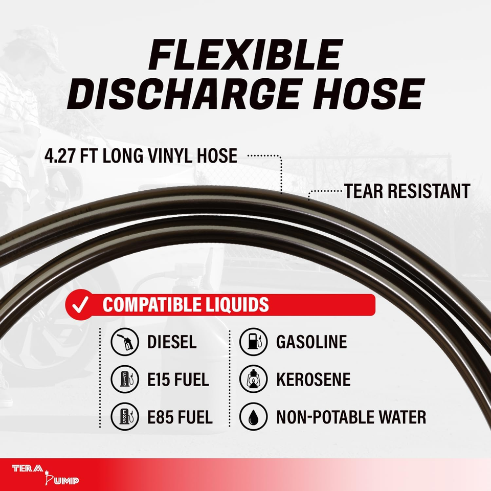 KEY FEATURES - We improved our fuel transfer pump to include a Built-In Universal Gas Can Adapter to eliminate the need for multiple individual gas can adapters. The multi-thread adapter is compatible with Briggs Stratton, No-Spill Cans, Midwest Cans, North American Gas Cans, and other Utility Jugs. Transfer up to 2.3 Gallons per Minute with a durable 4.27ft Vinyl Hose (ideal for refueling Fuel Cells, Tractors or Boats) that is resistant to minor cuts or damage sustained during shipping.
