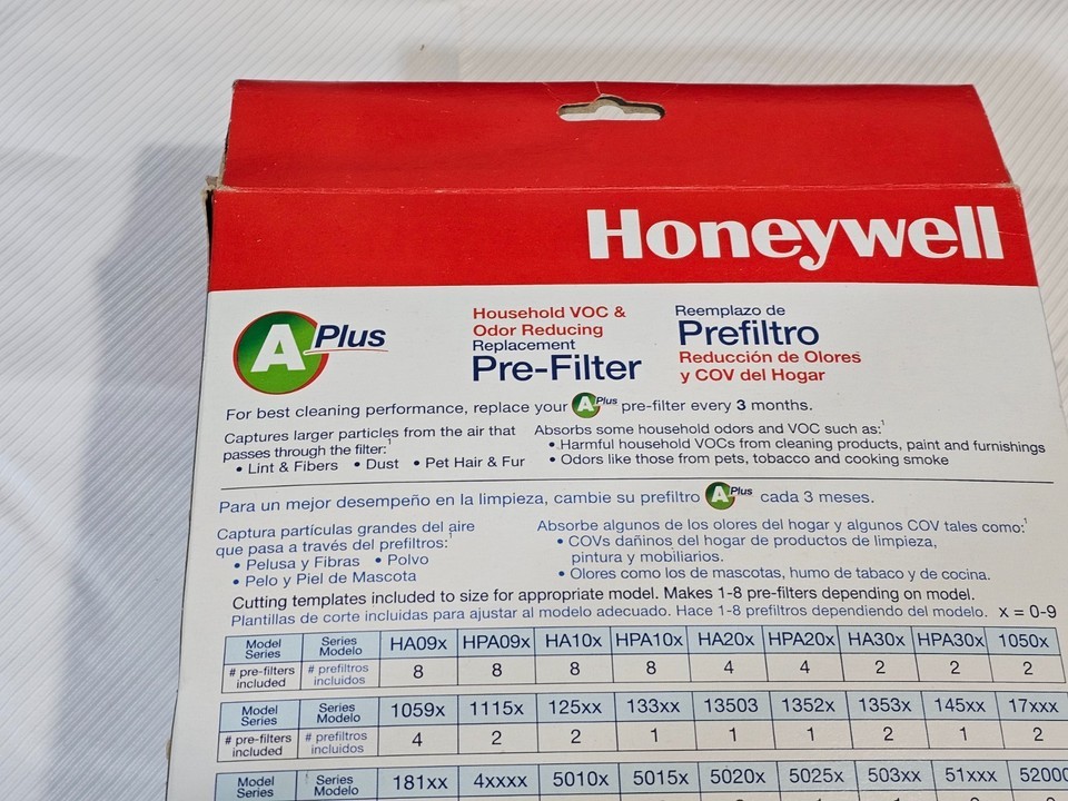 Description of item: This is a genuine Honeywell HRF-AP1 ?Filter A Plus? pre-filter, designed for use with many Honeywell True HEPA air purifiers. The A+ pre-filter helps capture larger airborne particles such as dust, lint, fibers, and pet hair while also reducing household odors and VOCs with activated carbon and zeolite.