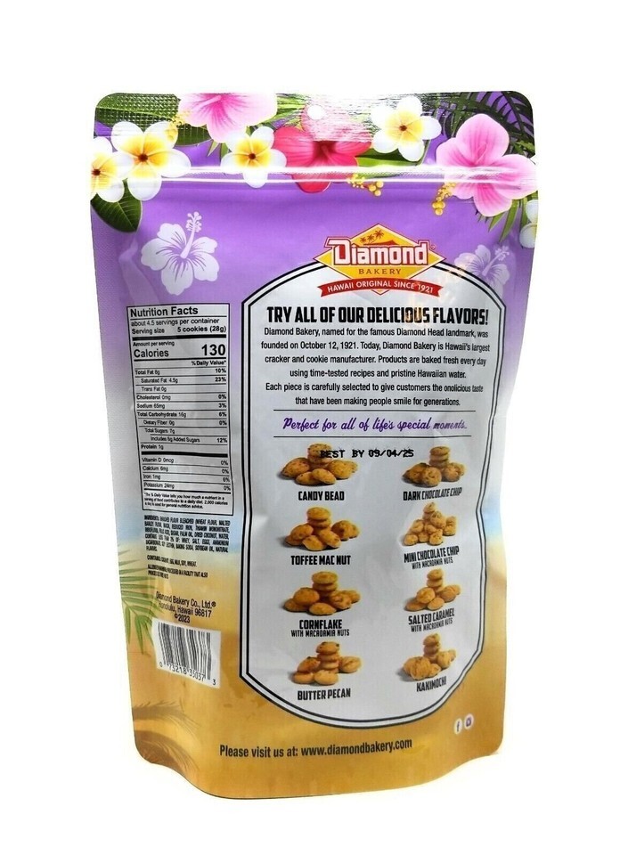 Enjoy a delicious tropical treat with Diamond Bakery's Hawaiian Coconut Cookies! Baked fresh in Honolulu using time-tested island recipes, these cookies deliver authentic coconut flavor in every crunchy bite. The 4.5 oz resealable pouch keeps them fresh for snacking any time. Perfect for sharing, gifting, or just enjoying with a cup of coffee or tea.