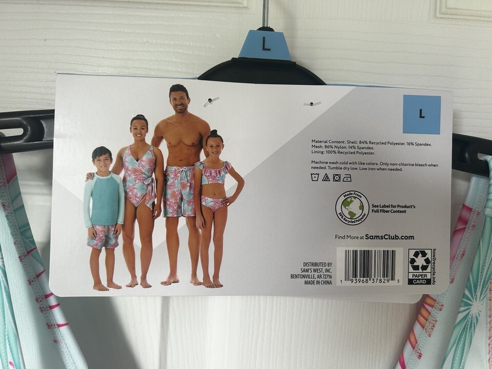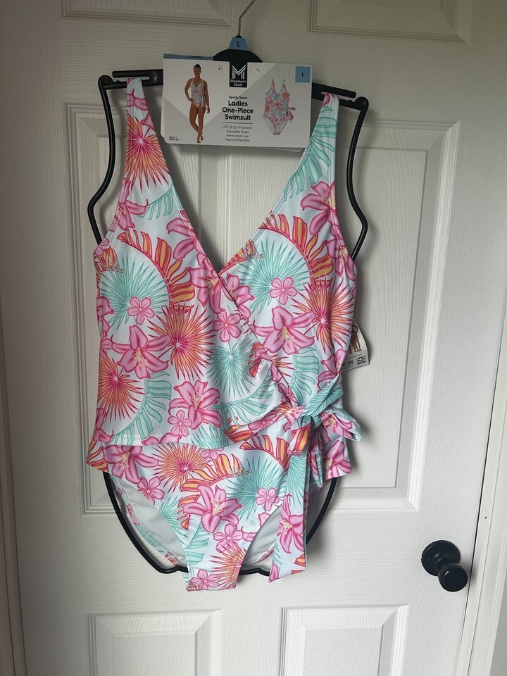 Get ready to make a splash with this stunning Member's Mark Ladies Family Swim Adjustable Strap large One Piece Swimsuit in the beautiful Laguna Lilies color. This swimsuit features a floral pattern and is made with a blend of 14% Spandex and 86% Nylon for a comfortable and stretchy fit. The adjustable straps and functional ties at the waist ensure a perfect fit for all body types.