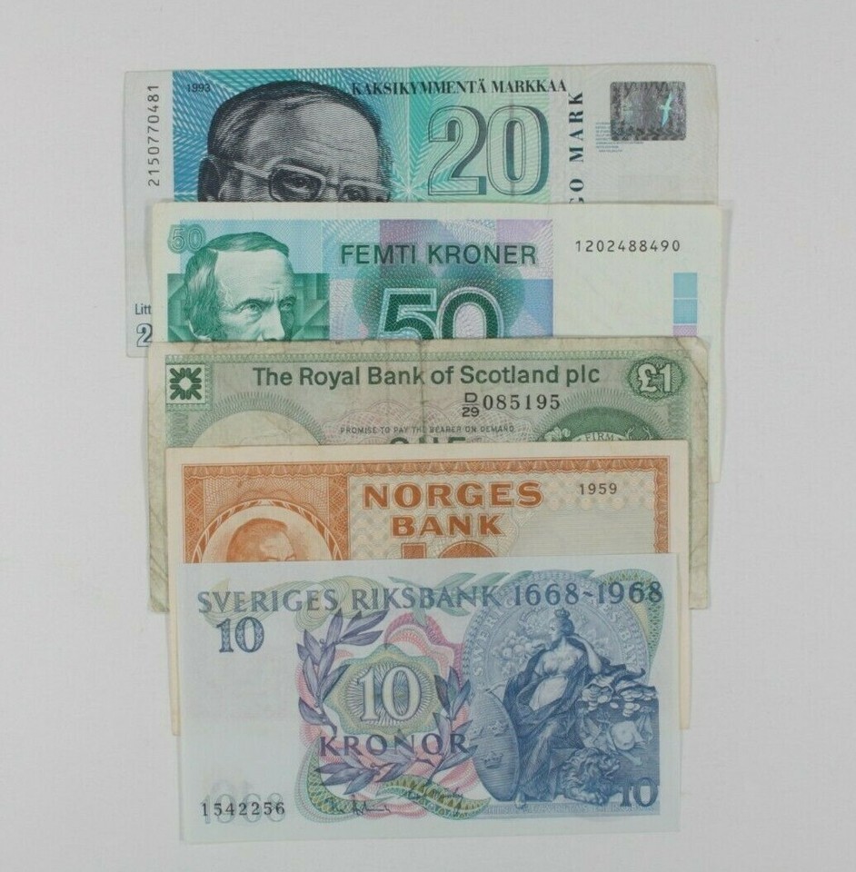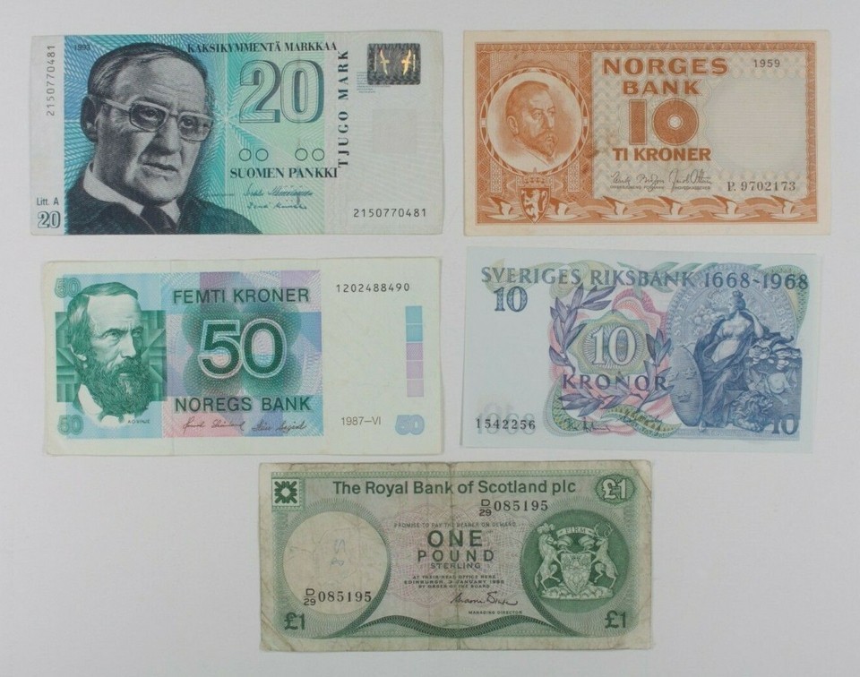 Northern European Nations 5-Notes Lot // Finland, Norway, Scotland & Sweden
