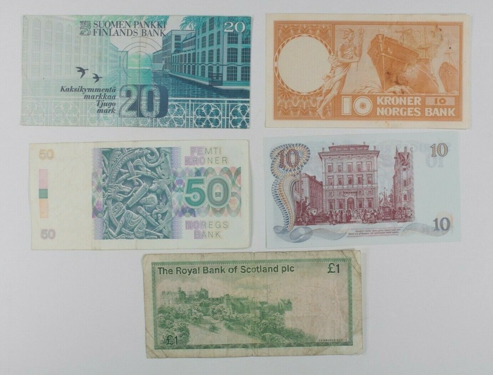 Northern European Nations 5-Notes Lot // Finland, Norway, Scotland Sweden
