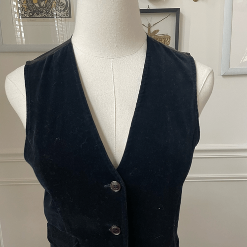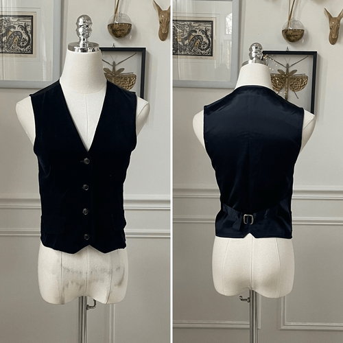 Vintage 70s Marianne Fashions made in japan black cotton velveteen 4 button vest with acetate back. Adjustable slide buckle at the back waist for a little waist definition. Tag size small, but closer to a modern size extra small. Laying Flat measures 19.5? shoulder to hem at the longest point and 15? armpit to armpit. please double check measurements to ensure the proper fit for you.