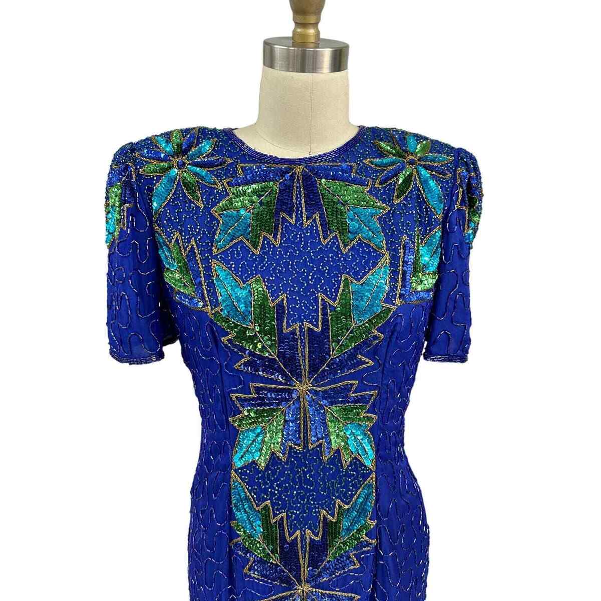 Mob Wife 80s VTG Beaded/Sequin Blue/Green Cocktail Dress Robert Anthony Sz 8