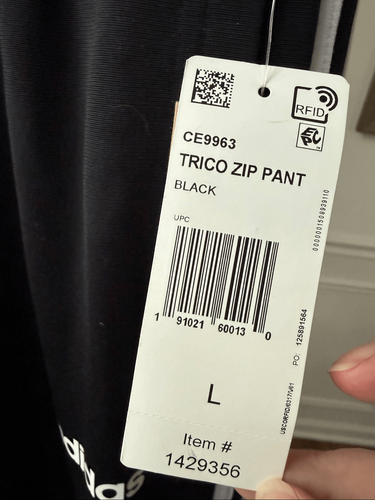 New with tags, Adidas Men's Black Sz Large Trico Ankle Zip Leg Pants, item1429356. 100% polyester. Laying flat measures 15 inches straight across the waist with a 12 inch rise and 32? inseam